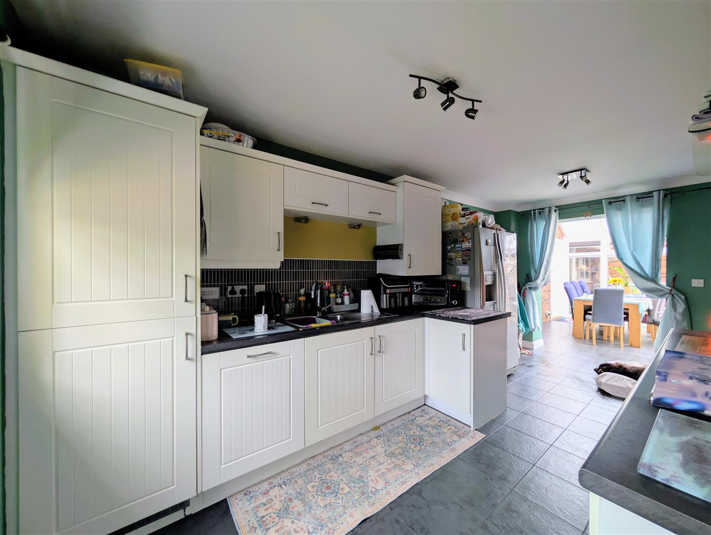 Kitchen/Diner - 5.51m x 2.64m (18'1 x 8'8) - Base and wall mounted units, laminated worktops, tiled splashbacks, single drainer one and a half bowl stainless steel sink unit with a mixer tap, built in four burner gas hob, electric double oven and extractor hood, built in dishwasher, built in fridge/freezer, tiled floor, double radiator, coved ceiling, upvc double glazed window to front elevation, opening into the: