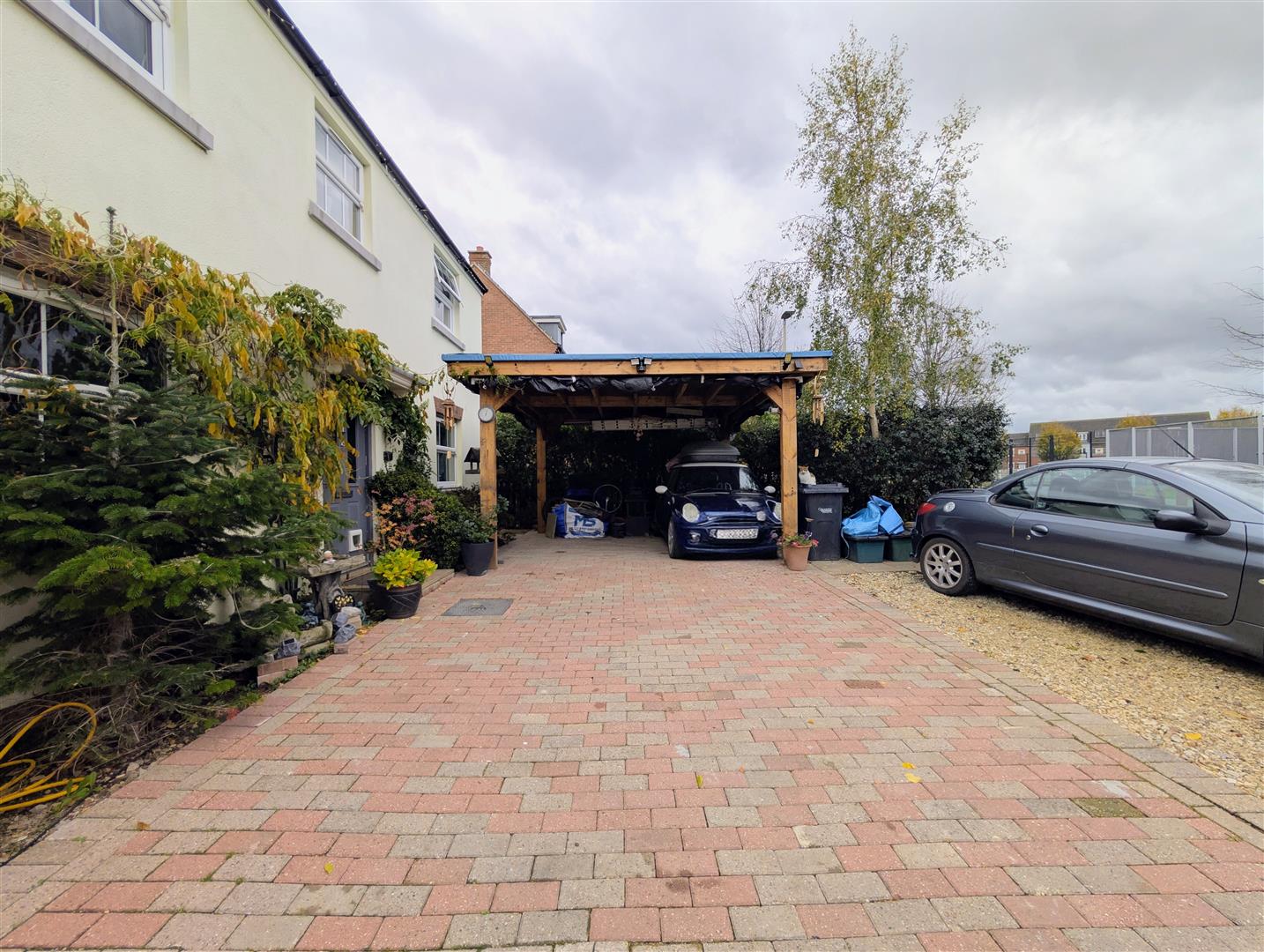 Outside - To the front there is block paved off road parking leading to a double carport, flower borders, plants and bushes. To the side there is a tarmacadam driveway leading to an: