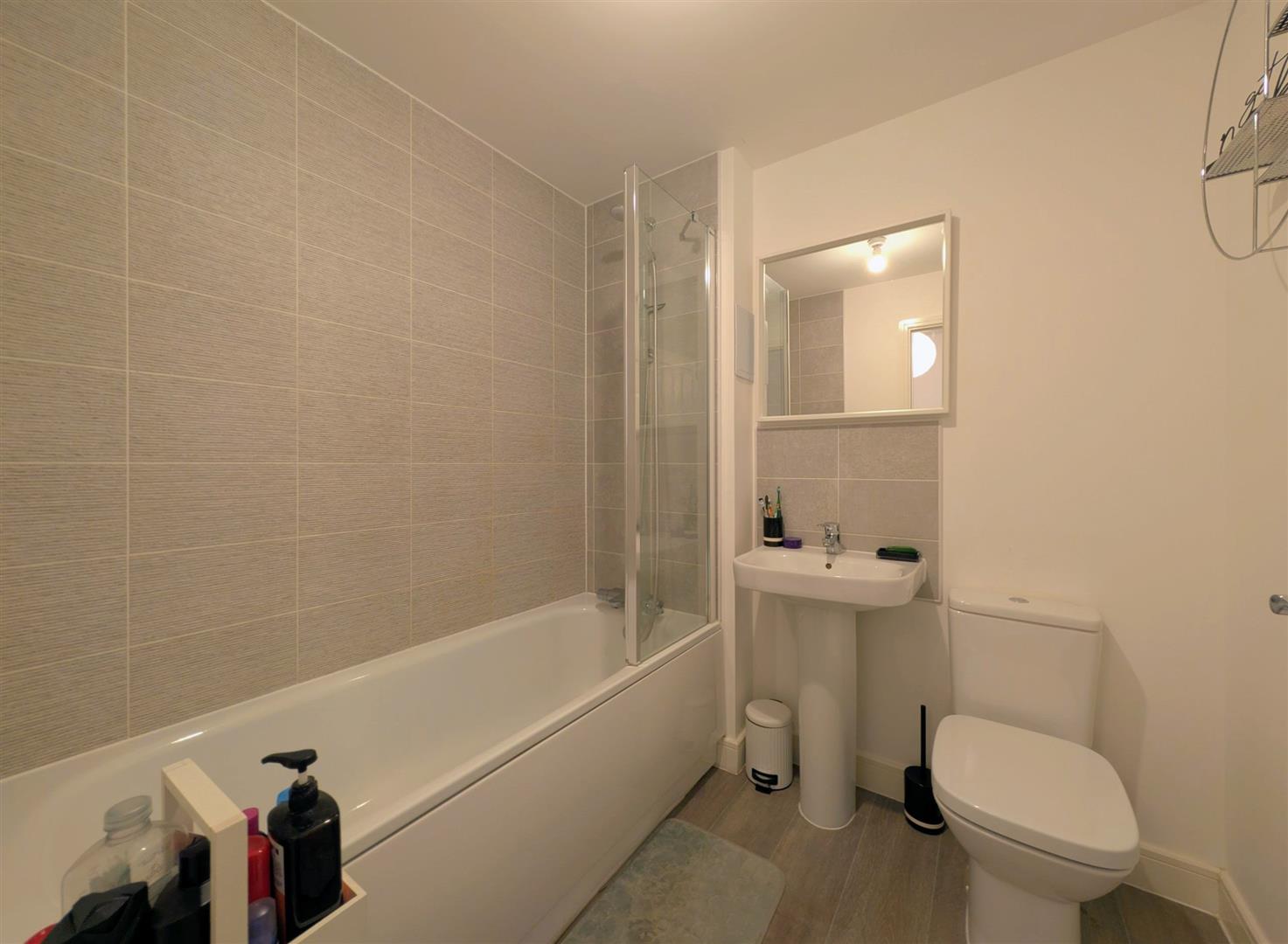 Bathroom - White suite comprising modern panelled bath, pedestal wash hand basin, close coupled w.c., part tiled walls, radiator.
