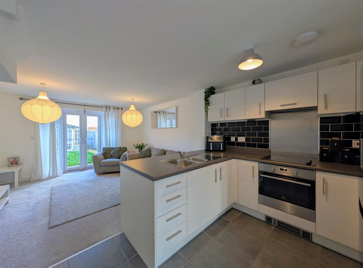 Open Plan Kitchen/Family Room - 6.72m x 3.99m (22'0" x 13'1") - Modern kitchen comprising a range of base, drawer and wall mounted units, roll edge worksurface, stainless steel sink and drainer unit with a mixer tap, space for larder style fridge/freezer, electric hob and oven with extractor hood over, tiled splashbacks, tiled flooring, stairs leading off, radiator, power points, upvc double glazed French doors and matching side lights gives access onto the rear garden.