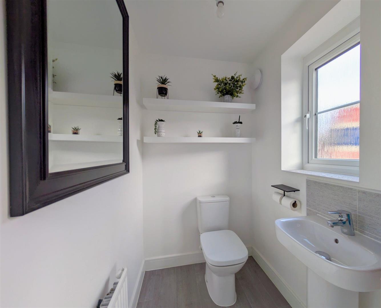 Cloakroom - Close coupled w.c., pedestal wash hand basin, tiled splashbacks, radiator, laminate flooring, upvc double glazed opaque window to front aspect.