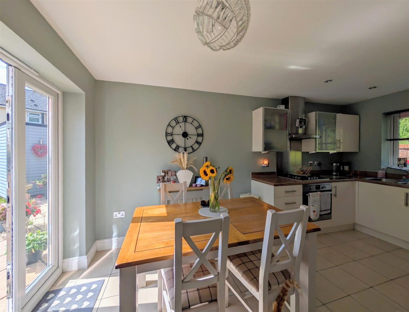 Kitchen/Diner - 4.64m x 3.53m (15'2" x 11'6" ) - A modern cream High Gloss kitchen comprising of a range of base, drawer and wall mounted units, roll edge worksurface, stainless steel sink and drainer unit with a mixer tap, cupboard housing the Ideal boiler supplying gas fired central heating, integral fridge/freezer, integral dishwasher, space and plumbing for automatic washing machine, gas hob, electric oven, extractor hood, two radiators, tiled flooring, upvc double glazed window to front aspect, upvc double glazed French doors onto the enclosed rear garden.
