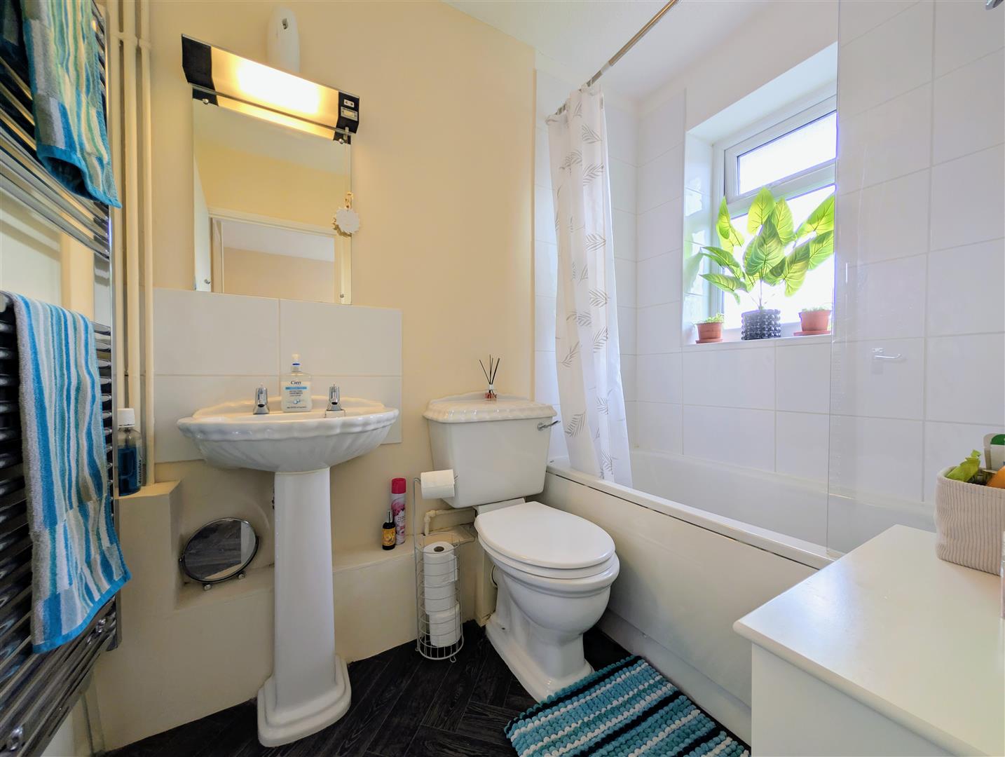 Bathroom - 2.06m x 1.45m (6'9 x 4'9) - White suite comprising panelled bath with a mixer tap and showerhead attachment, low level w.c., pedestal wash hand basin chrome heated towel rail, shaver point and light, partially tiled walls, upvc double glazed window to rear elevation.