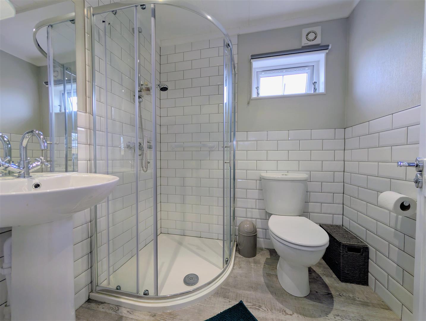 En-Suite Shower Room - 1.91m x 1.57m (6'3 x 5'2) - Corner shower enclosure and unit, low level w.c., pedestal wash hand basin with a mixer tap, partially tiled walls, shaver point and light, downlighters, extractor fan, chrome heated towel rail, upvc double glazed window to side elevation.