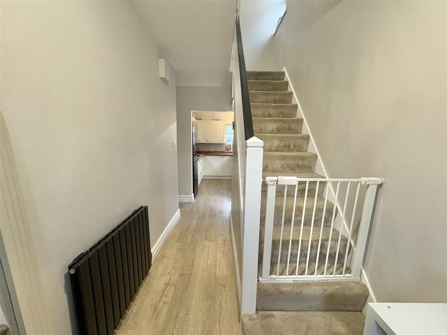 Entrance Hall - Stairs leading off with open store cupboard under, radiator, laminate wood flooring.