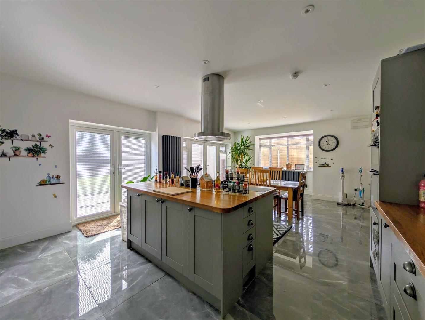 Kitchen/Diner/Family Room - 7.39m x 4.72m max (24'3 x 15'6 max) - A range of base and wall mounted units, oak worktops, Belfast style sink unit with a mixer tap, built in washing machine, tumble dryer, dishwasher and electric double oven, space for an American style fridge/freezer, Island unit housing a five burner gas hob with extractor hood over with drawers and cupboards, cupboard housing the gas fired combination boiler, double designer radiators, marble floor, downlighters, upvc double glazed bay window to front elevation, matching French doors to side elevation onto the patio.