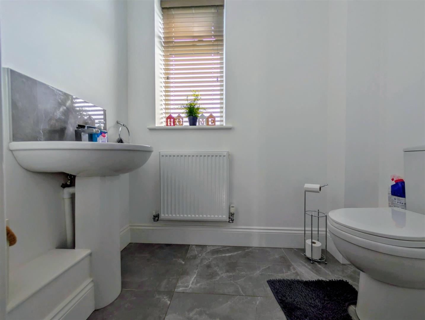 Cloakroom - 1.98m x 1.09m (6'6 x 3'7) - White suite comprising pedestal wash hand basin with a mixer tap and tiled splashback, low level w.c., marble floor, single radiator, downlighters, extractor fan, upvc double glazed window to rear elevation.