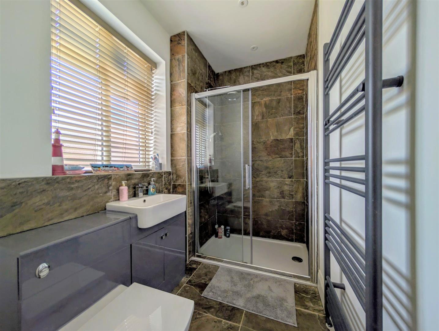 En-Suite Shower Room - 2.51m x 1.57m (8'3 x 5'2) - Double walk in shower enclosure with a Mira Realm shower, low level w.c., wash hand basin with a mixer tap and cupboard below, partially tiled walls, natural stone slate tiled floor, towel radiator, downlighters, extractor fan, upvc double glazed window to front elevation.