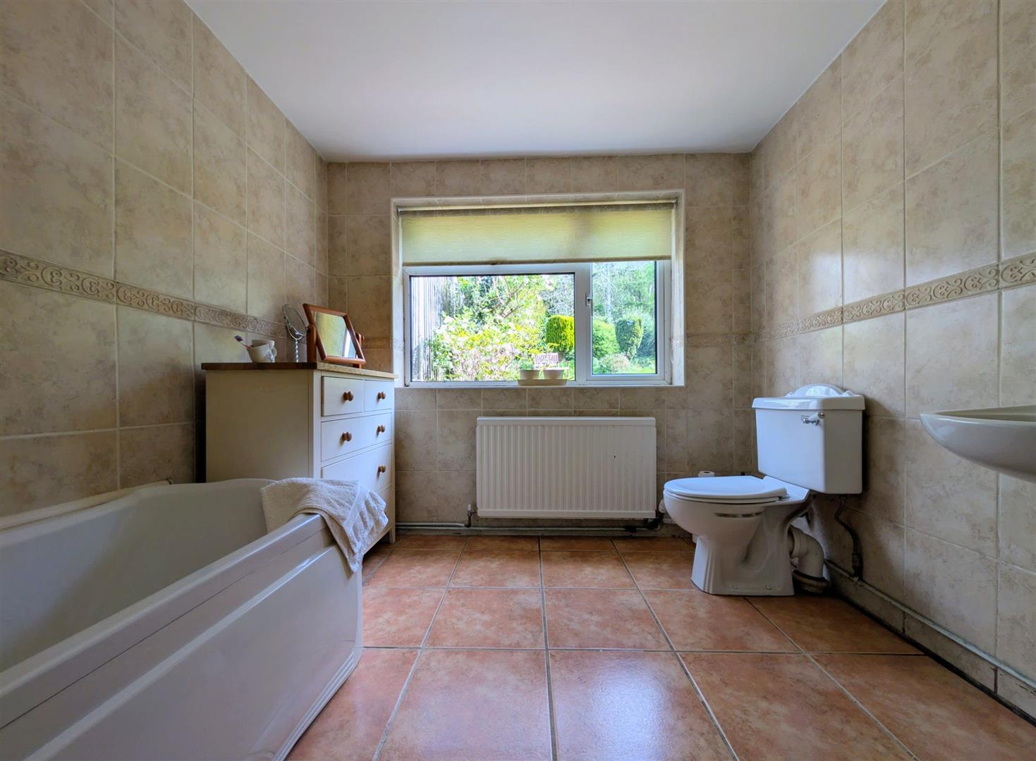 Bathroom - 2.74m x 2.51m (9' x 8'3) - White suite comprising panelled bath, low level w.c., pedestal wash hand basin, fully tiled walls, tiled floor, double radiator, upvc double glazed window to rear elevation overlooking the rear garden.