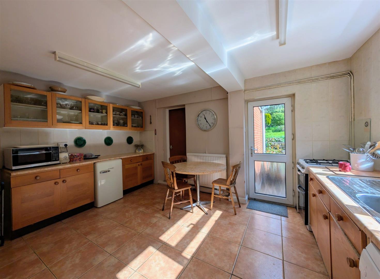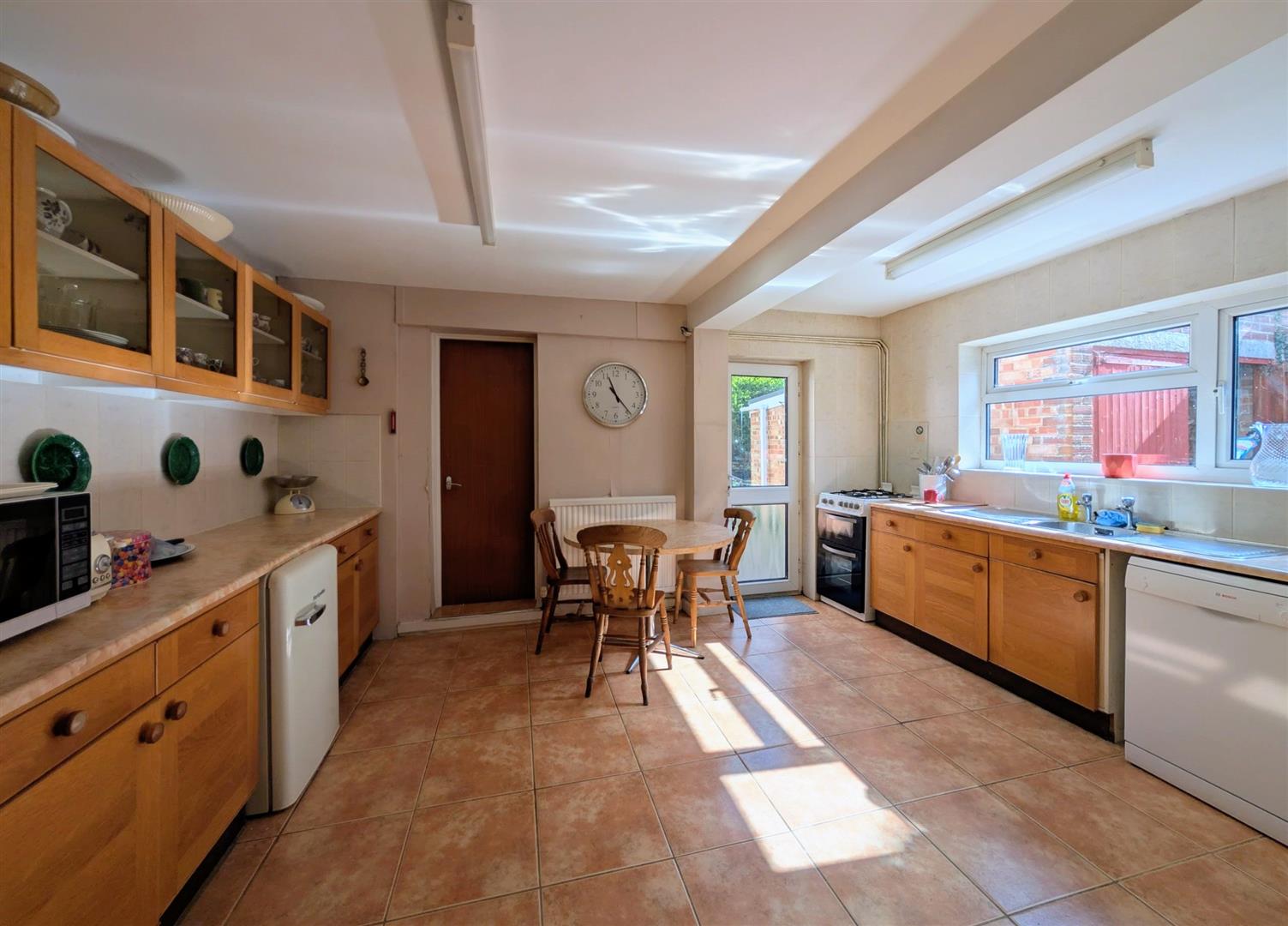 Kitchen/Breakfast Room - 4.42m x 3.38m max (14'6 x 11'1 max) - Base and wall mounted units, laminated worktops, tiled splashbacks, double drainer single bowl stainless steel sink unit, gas cooker point, plumbing for an automatic washing machine and dishwasher, tiled floor, two double radiators, space for table and chairs, understairs storage cupboard, upvc double glazed window to side elevation, matching door to rear elevation.
