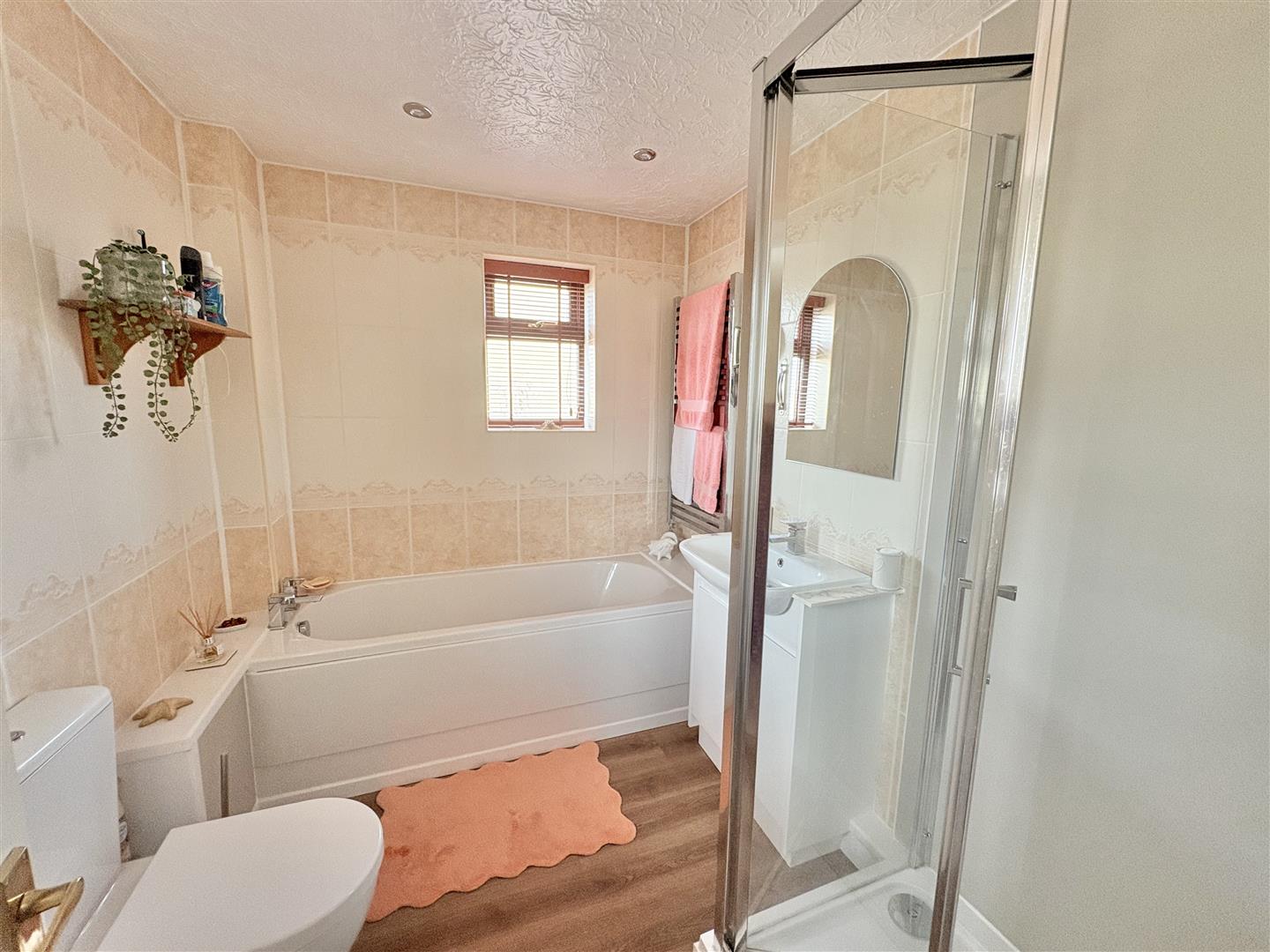 Bathroom - Modern white suite comprising panelled bath, wash hand basin with vanity unit below, close coupled w.c., double shower unit with an electric Mira shower, radiator, two opaque glazed windows to side and rear aspects.