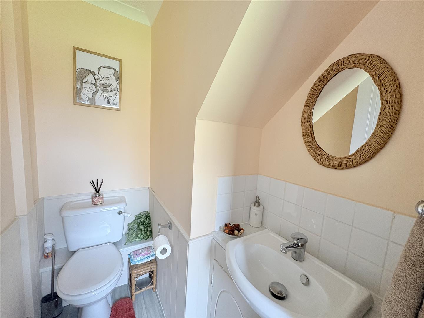 Cloakroom - White suite comprising close coupled w.c., wash hand basin with vanity unit below and tiled splashback.