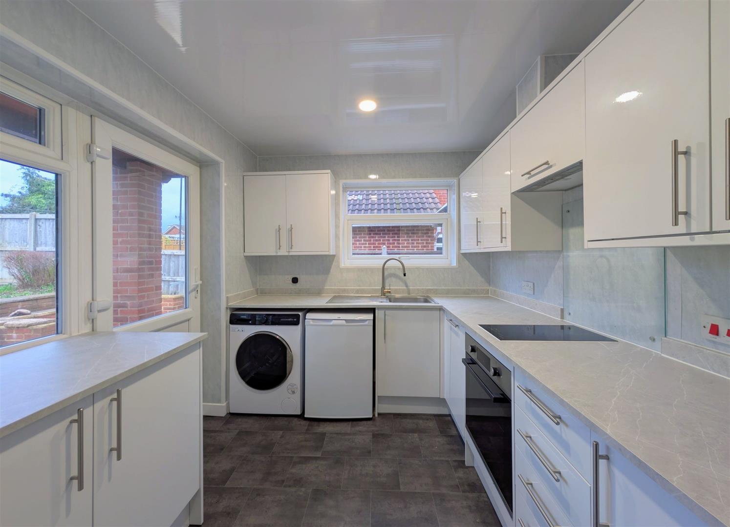 Kitchen - 2.67m x 2.36m (8'9 x 7'9) - Modern base and wall mounted units, laminated worktops and splashbacks, single drainer stainless steel sink unit with a mixer tap, fridge, washing machine, built in electric oven, ceramic hob, extractor hood and freezer, upvc double glazed window to side elevation, matching door and window to rear elevation onto the patio.