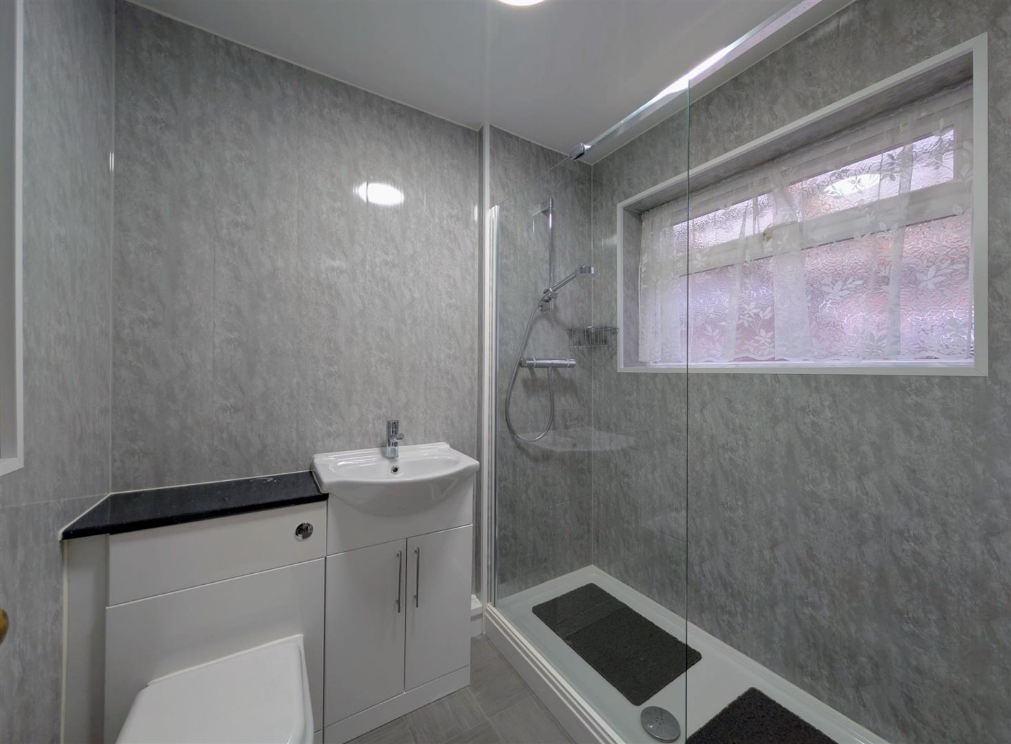 Shower Room - 2.67m x 1.60m max (8'9 x 5'3 max) - Double walk in shower enclosure and unit, low level w.c., wash hand basin with a mixer tap, worksurface and cupboard below, airing cupboard recess with a single radiator and shelving, upvc double glazed window to side elevation.