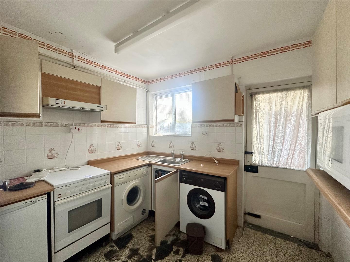 Kitchen - 2.74m x 2.38m (8'11" x 7'9") - Wood effect kitchen with tiled splashbacks, a range of base and wall mounted units, gas combination boiler (untested), understairs pantry with shelving, stainless steel sink and drainer, double radiator, power points, wooden door with a partially glazed window to rear elevation, aluminium single glazed window to rear elevation.