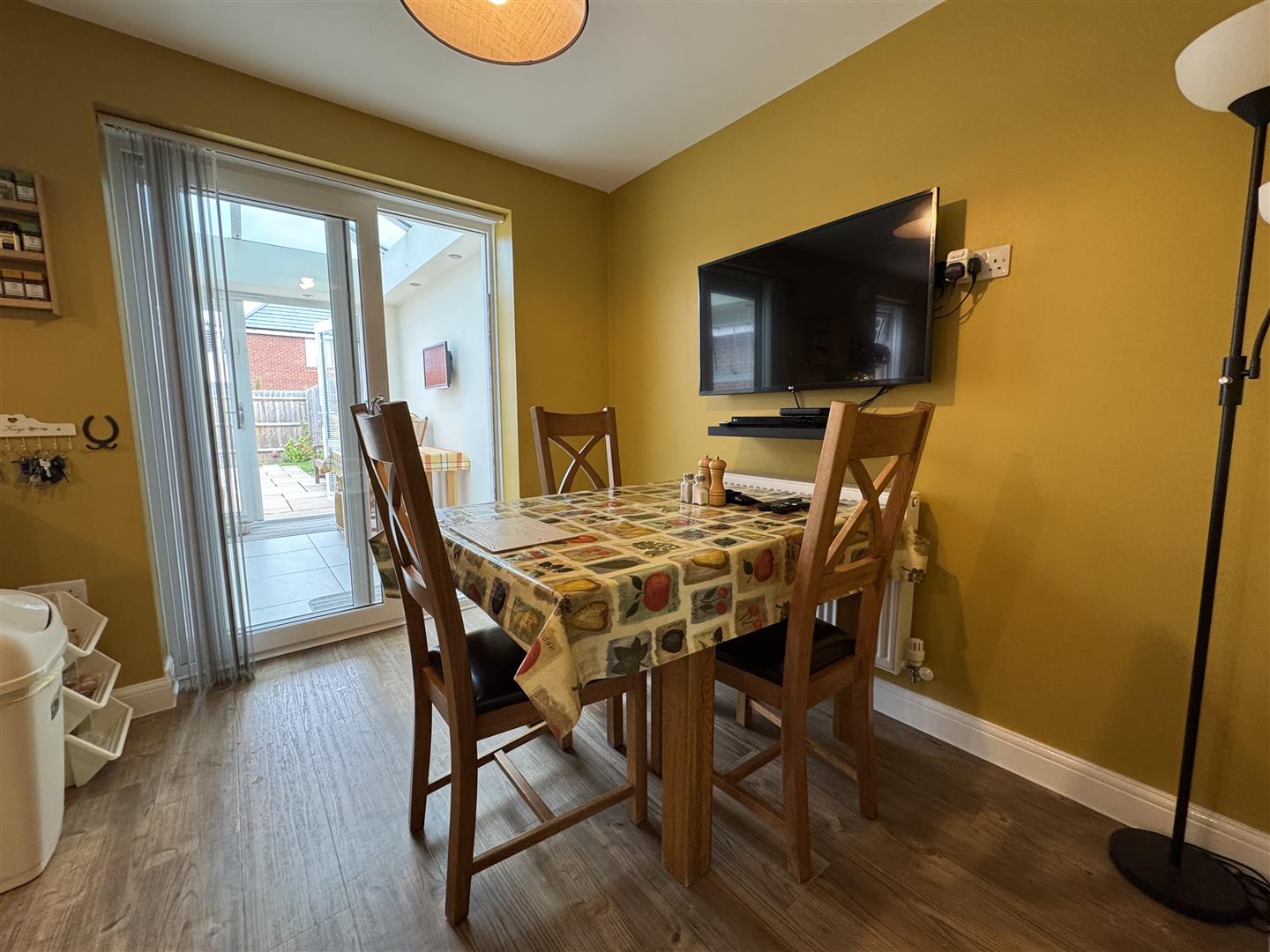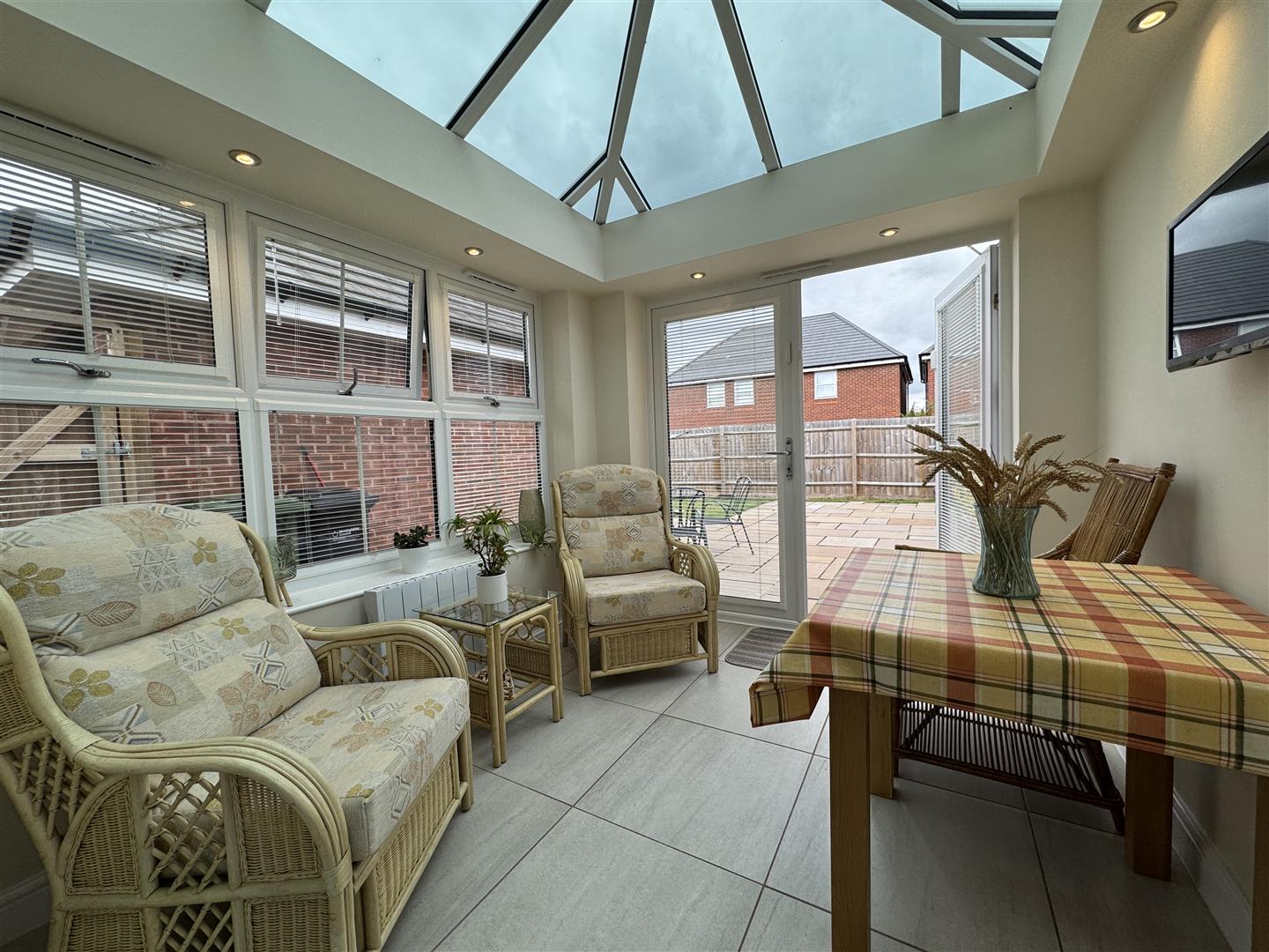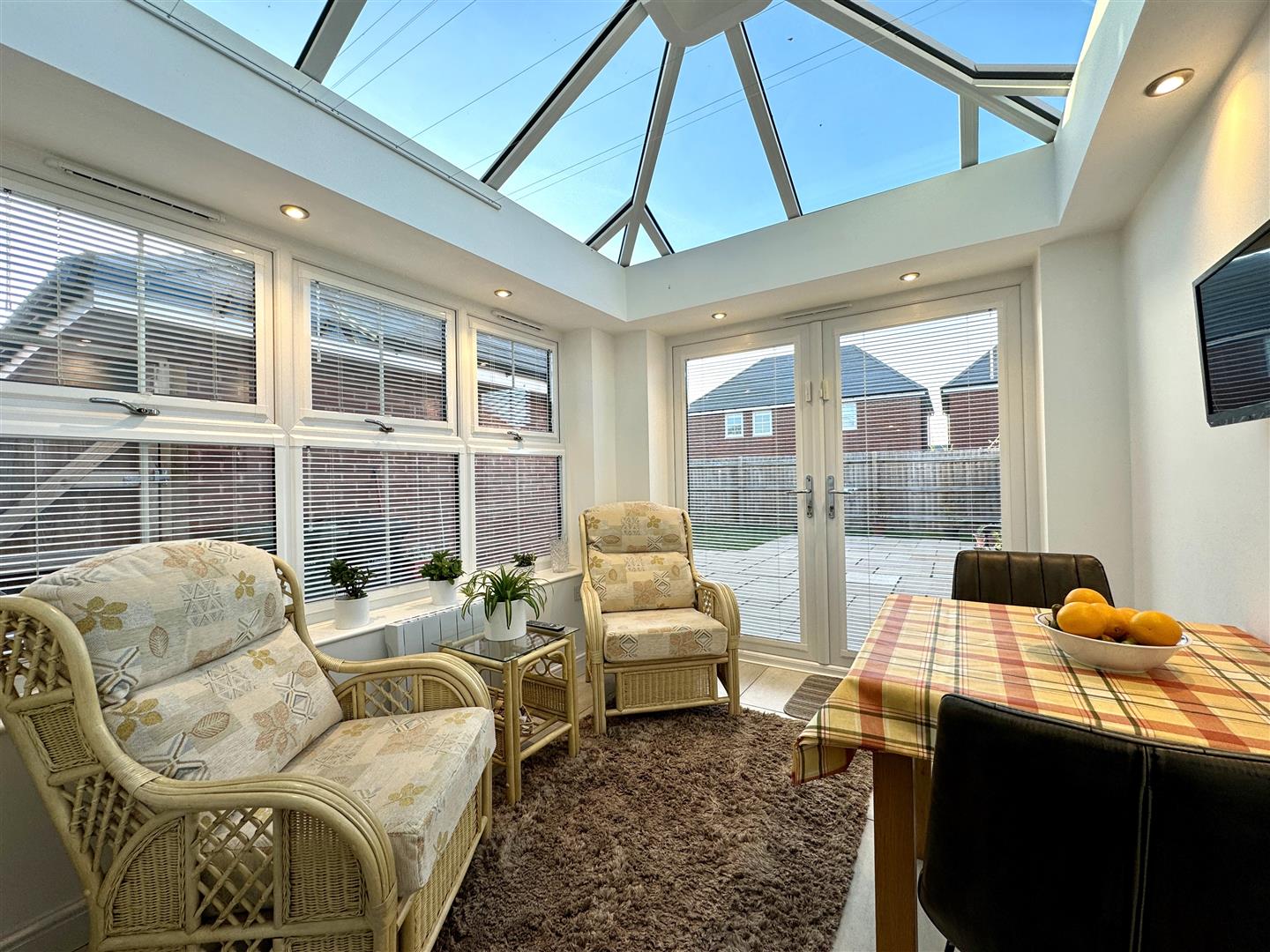 Sun Room - 2.64m x 2.49m (8'8 x 8'2) - Constructed in the last twelve months. This beautiful addition provides a second sitting room or breakfast area, has porcelain tiled flooring, electric room heater, inset spotlighting with dimmer switch, blue tinted glass roof, side aspect windows, double opening French doors leading to the rear.