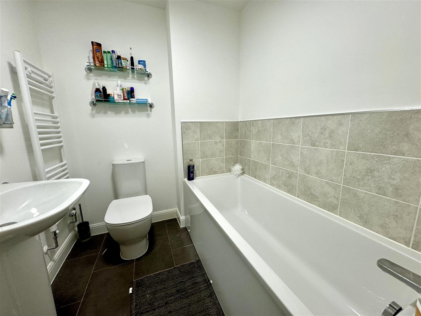 Bathroom - 2.16m x 1.75m (7'1 x 5'9) - Panelled bath with mixer tap, WC, pedestal wash hand basin with mixer tap, tiled floor, chrome heated towel rail, extractor fan.