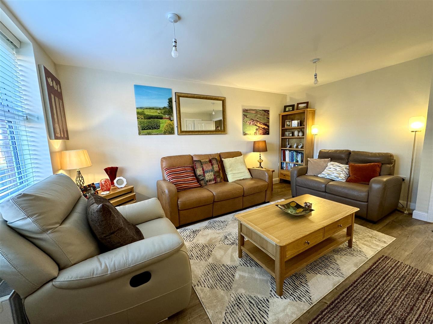Lounge - 4.57m x 3.58m (15'0 x 11'9) - Wood effect flooring, thermostat control, two radiators, door to under stairs storage area, front aspect window. Door to: