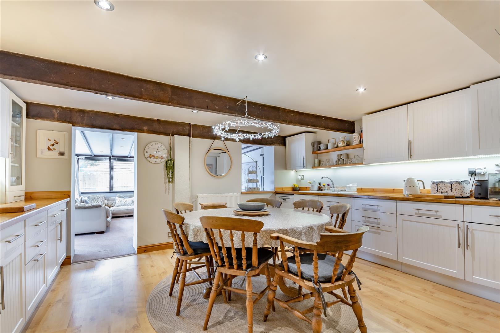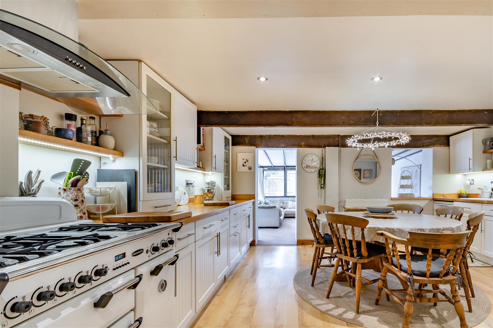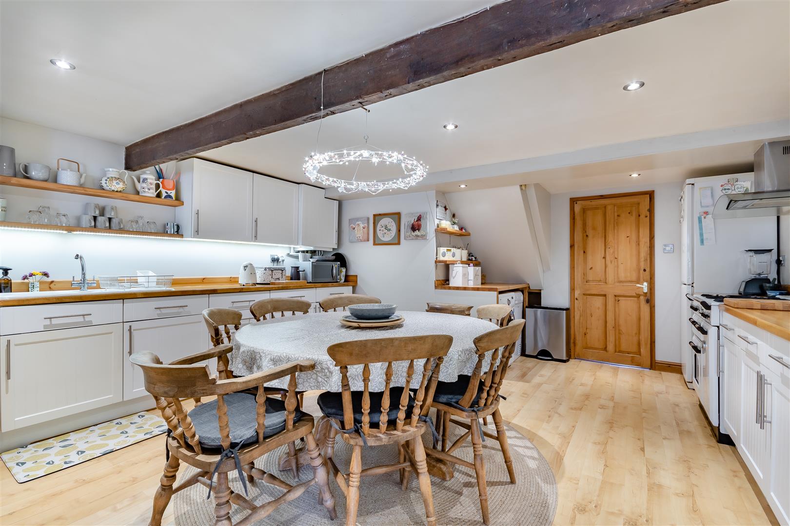 Kitchen / Breakfast Room - 5.03m x 4.75m (16'6 x 15'7) - Farmhouse style kitchen comprising of a range of base and wall mounted units with wooden worktops and splashbacks, one and a half bowl sink with mixer tap, plumbing for washing machine, space for tumble dryer, Rangemaster oven with five ring gas hob, space for tall fridge / freezer, plumbing for dishwasher, wood laminate flooring, inset spotlighting, exposed beams, double radiator, former window opening and door opening through to: