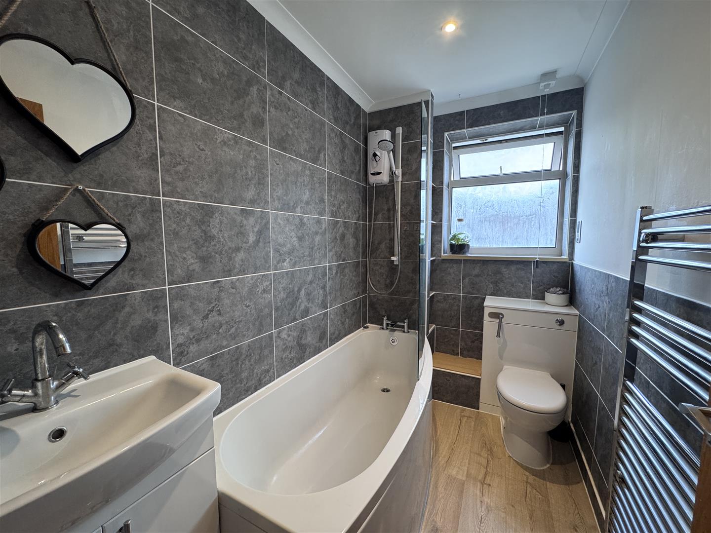 Bathroom - White suite comprising modern panelled bath with shower over, tiled surround, close coupled WC, vanity wash hand basin with cupboards below, tiled splashback, heated towel rail, rear aspect frosted window.