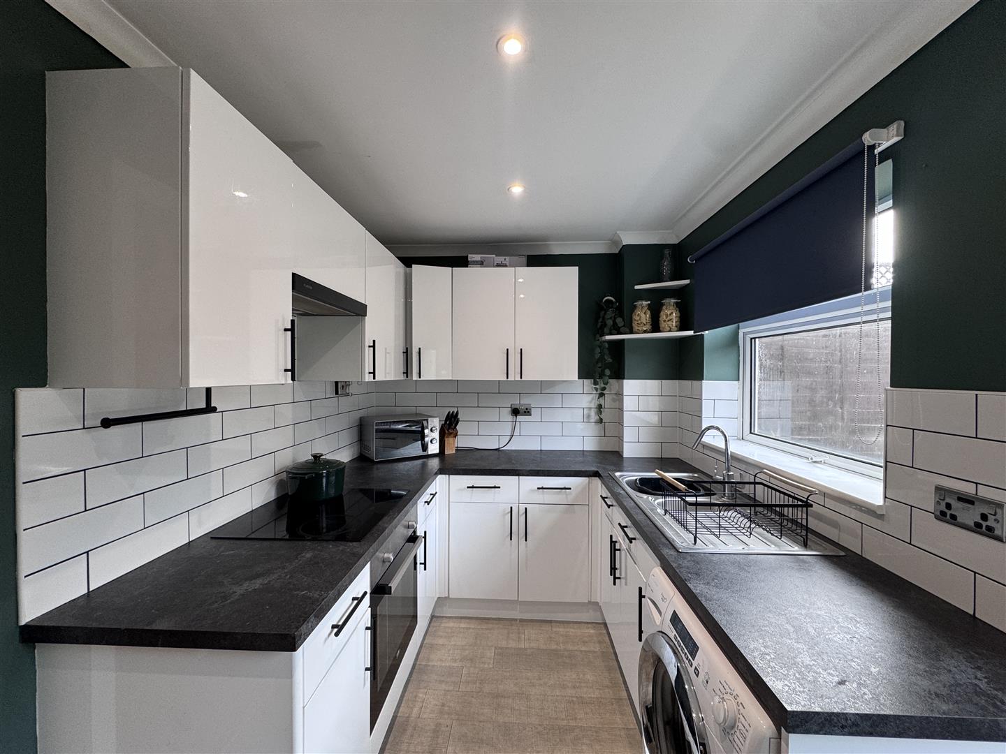 Kitchen - 3.56m x 2.11m (11'8 x 6'11) - One and a half bowl stainless steel sink unit with mixer tap, cupboards under, range of base and wall mounted units, fitted electric oven with four ring hob over, cooker hood above, plumbing for washing machine, space for fridge / freezer, rear aspect window with a private outlook over the gardens. Half glazed frosted door through to the rear.