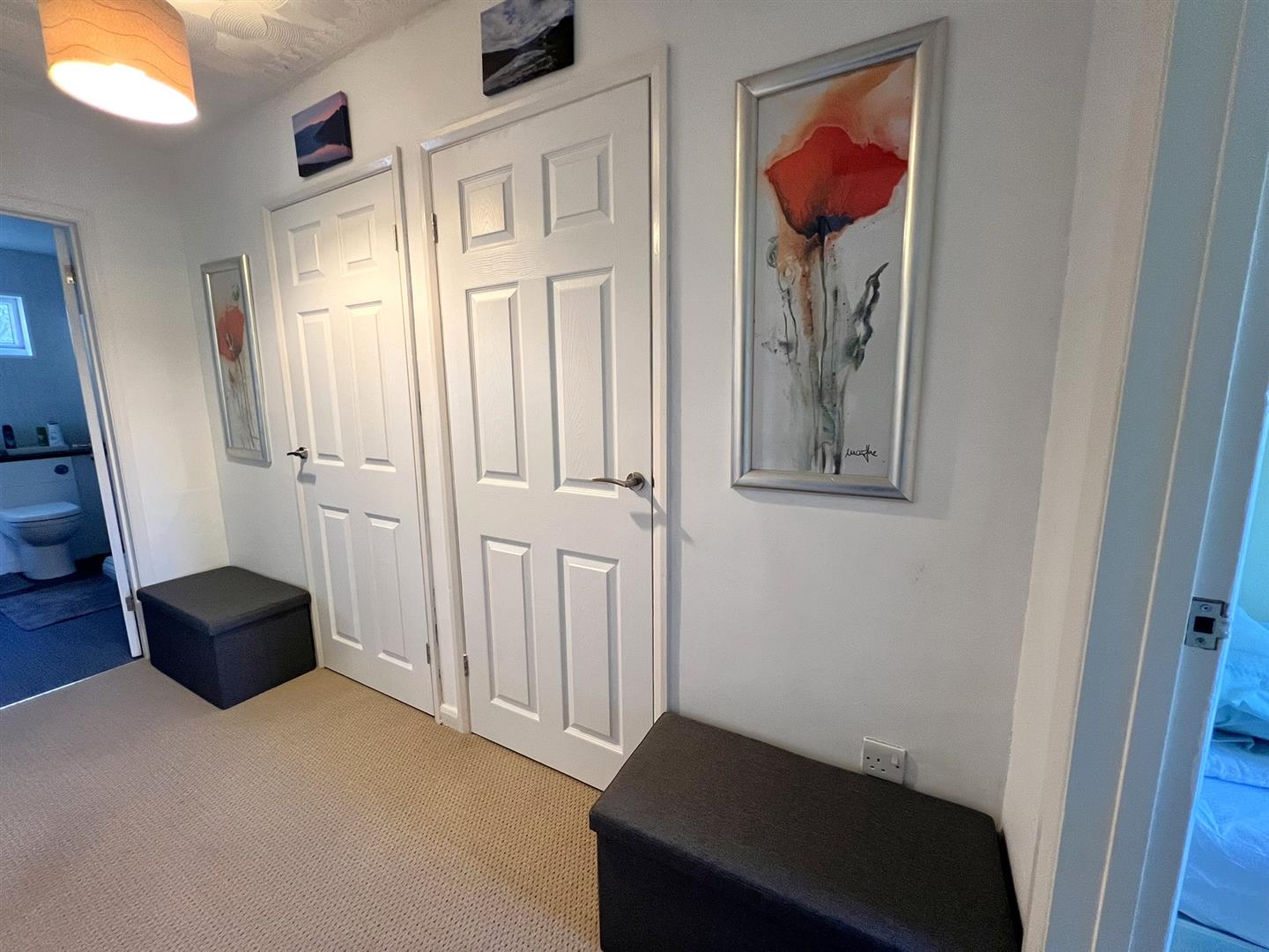 Landing - Ceiling light, power point, two doors providing access to storage cupboards, one housing the gas fired central heating and domestic hot water boiler, access to roof space, wooden panel doors giving access into: