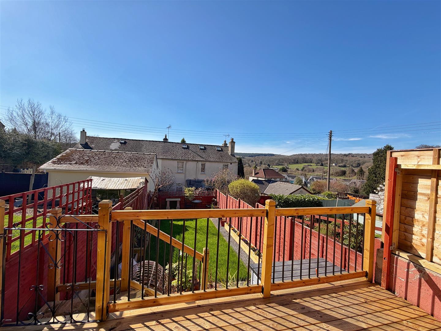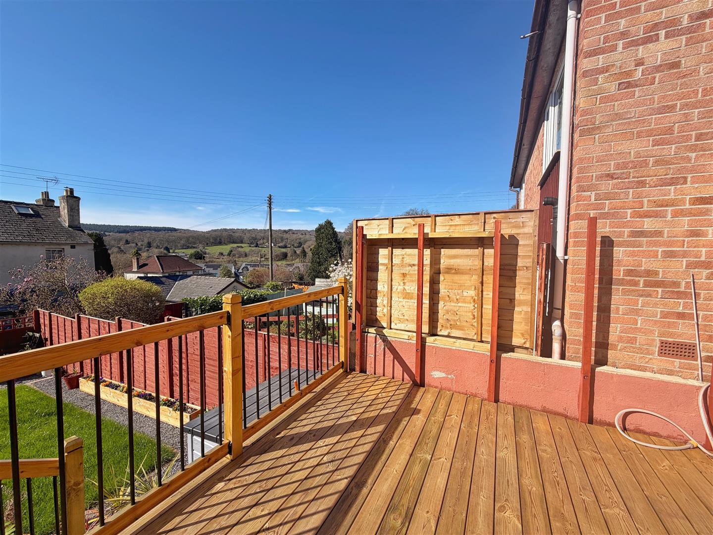 Enclosed rear garden featuring a newly fitted decked seating area ideal for enjoying the woodland surroundings. Steps lead down to a lower garden laid to lawn, with a gravel pathway providing access to the bottom of the garden. Raised planters offer space for flowers and planting, all enclosed by fencing.