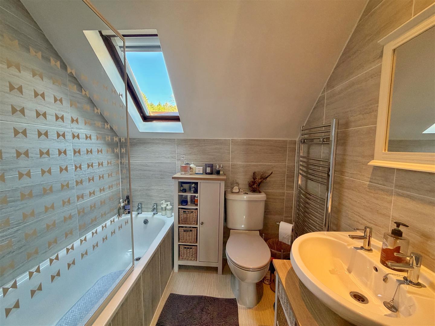 Bathroom - 1.96m x 1.63m (6'05 x 5'04) - Comprising a panelled bath with shower over and patterned shower screen, pedestal wash hand basin and WC. Heated towel rail and uPVC double-glazed skylight window to the front.