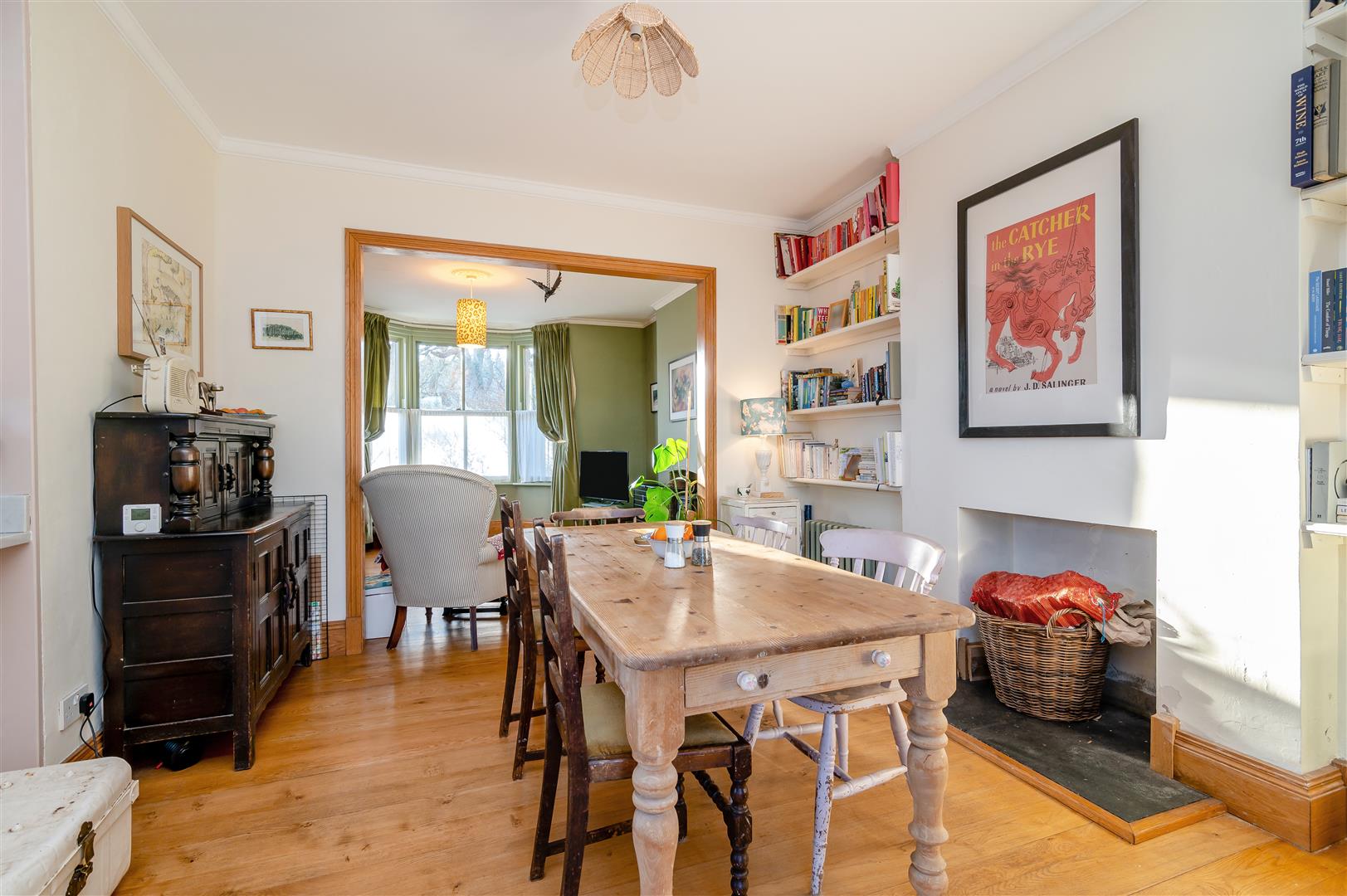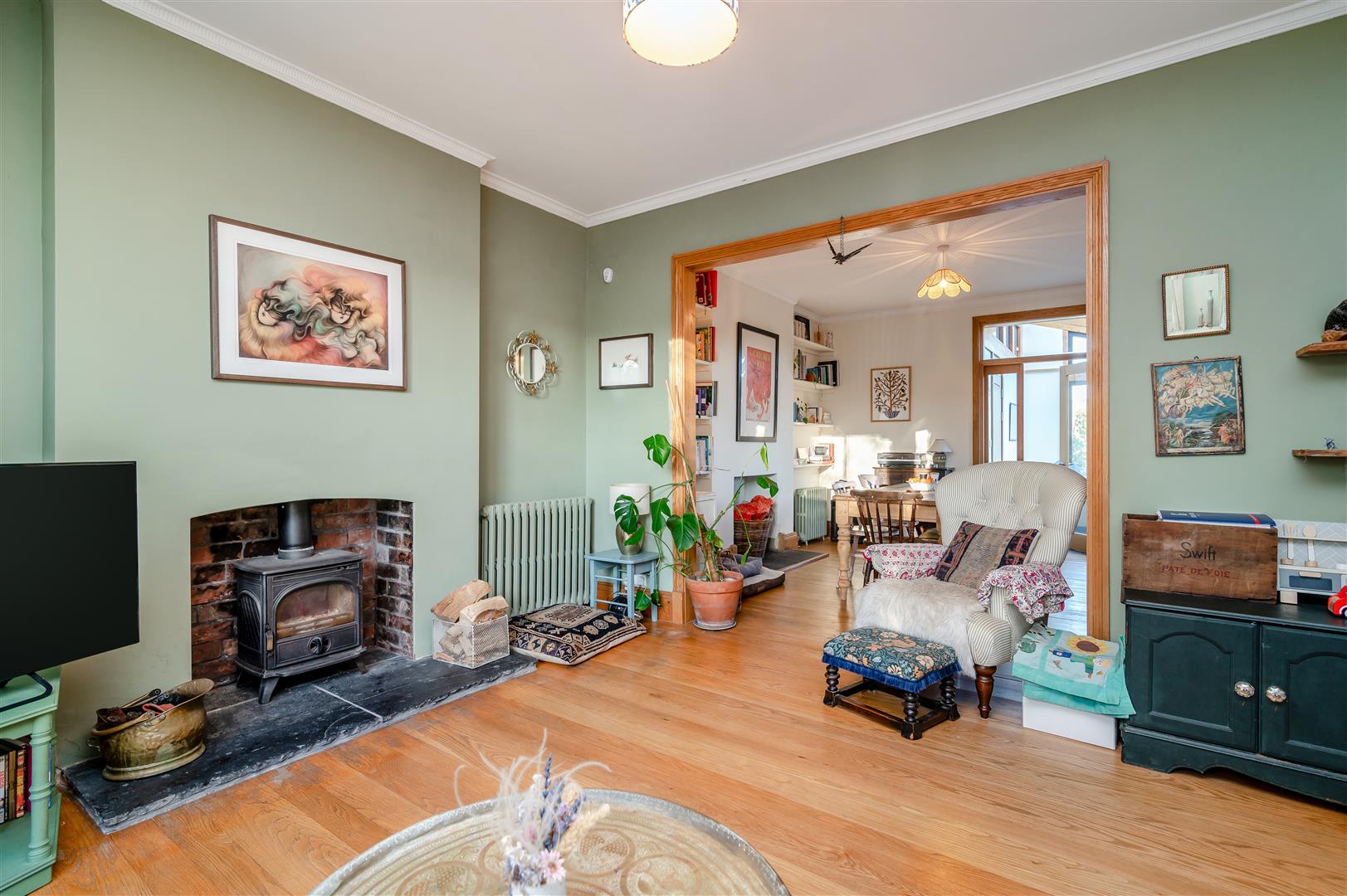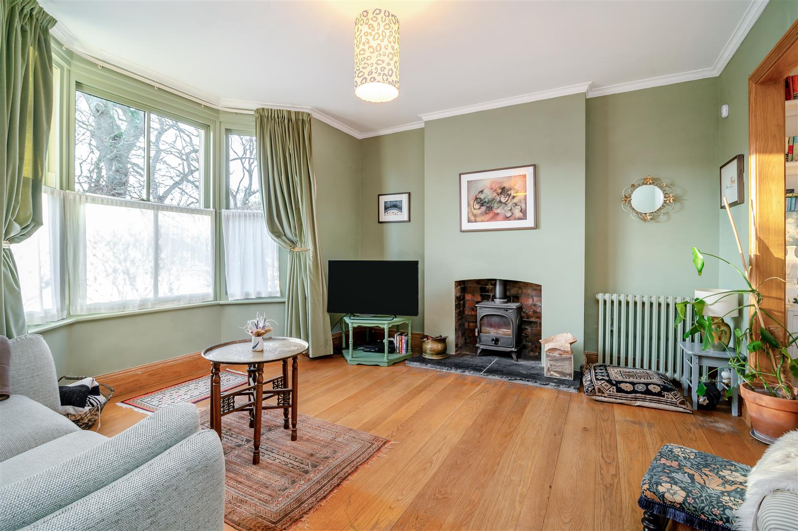 Sitting Room - 4.27m x 4.32m (14'00 x 14'02) - Featuring a bay window to the front, a feature brick fireplace with inset wood-burning stove and oak flooring flowing through to the dining area.