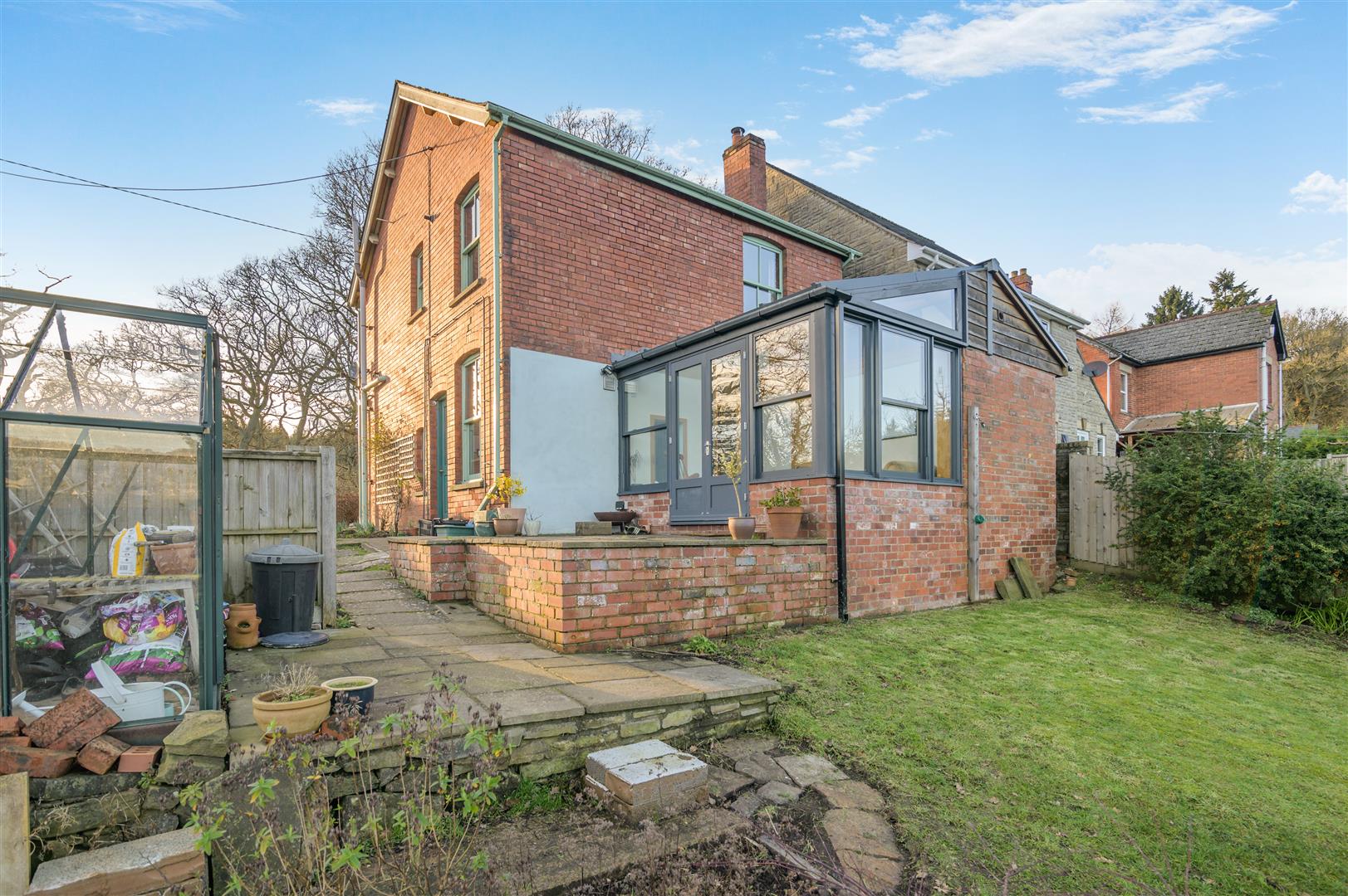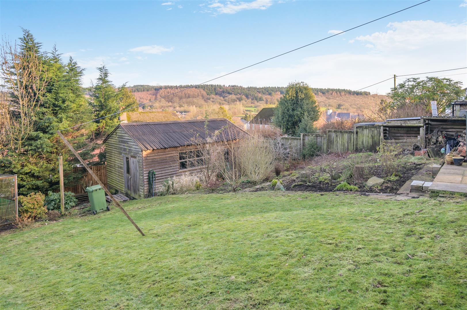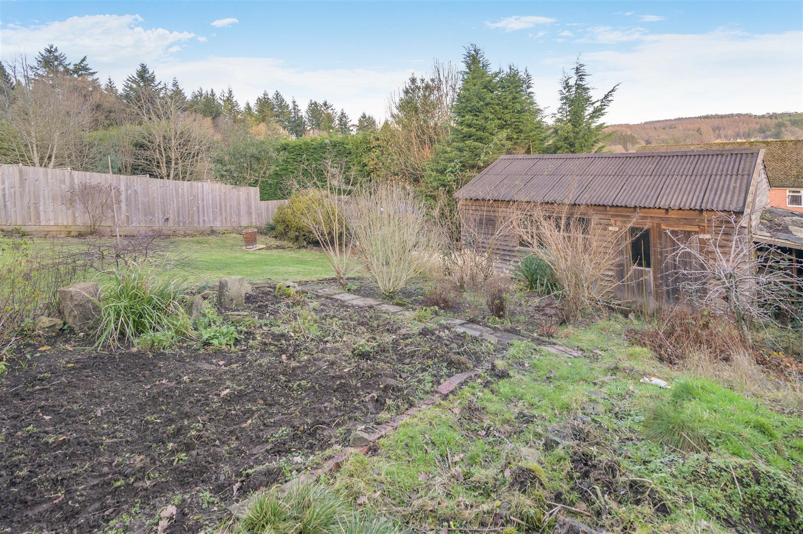 At this level are the studio/office, covered wood stores and greenhouse, from here there is a lawn area and vegetable patch and then the workshop is positioned at the lower end of the garden. The garden is securely enclosed by fencing.