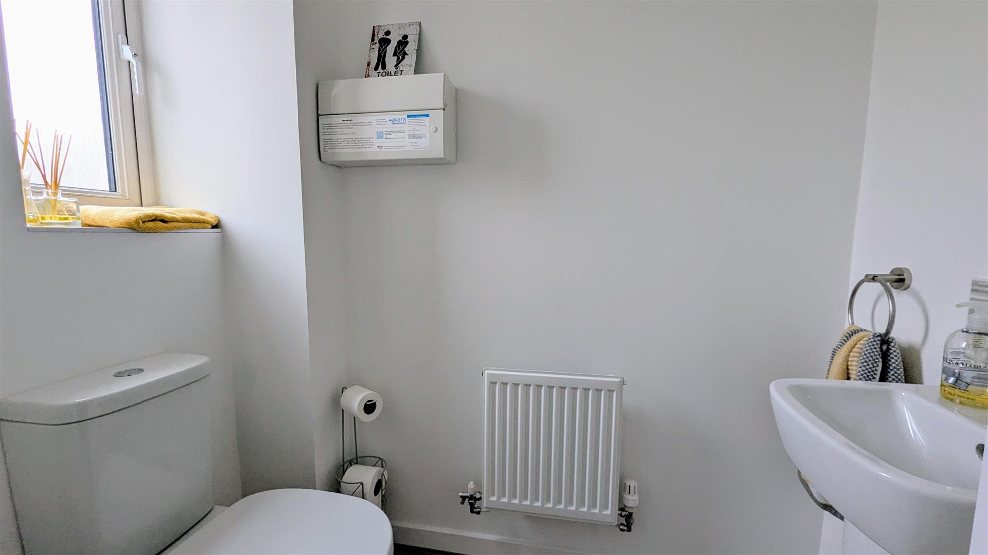 Cloakroom - Front aspect upvc double glazed frosted window, close coupled wc, sink with tap over, radiator, fuse box.