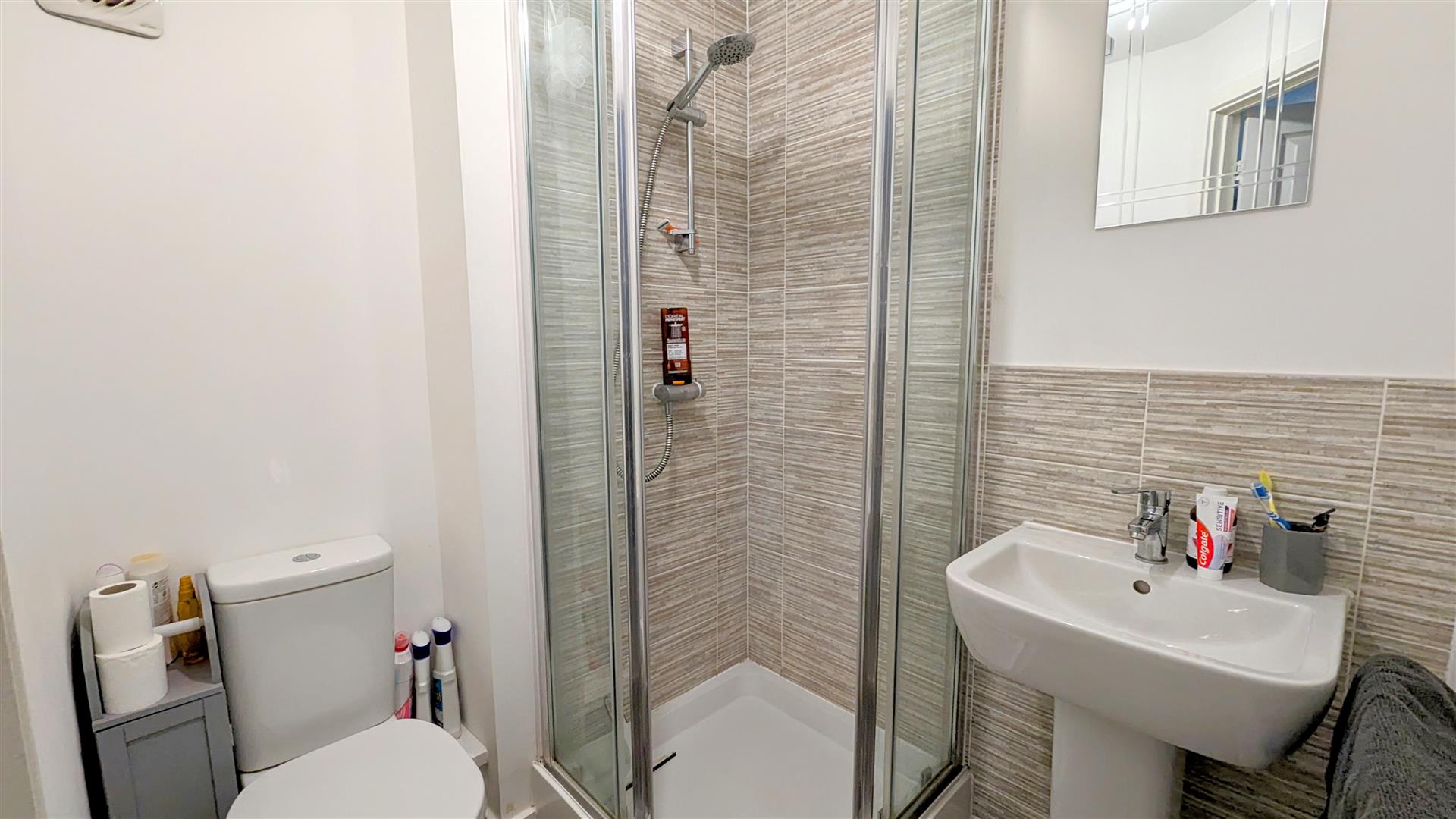 En-Suite - 1.65m x 1.47m (5'05 x 4'10) - Walk in shower with a mains shower overhead, close coupled wc, sink with tap over, radiator, extractor fan.