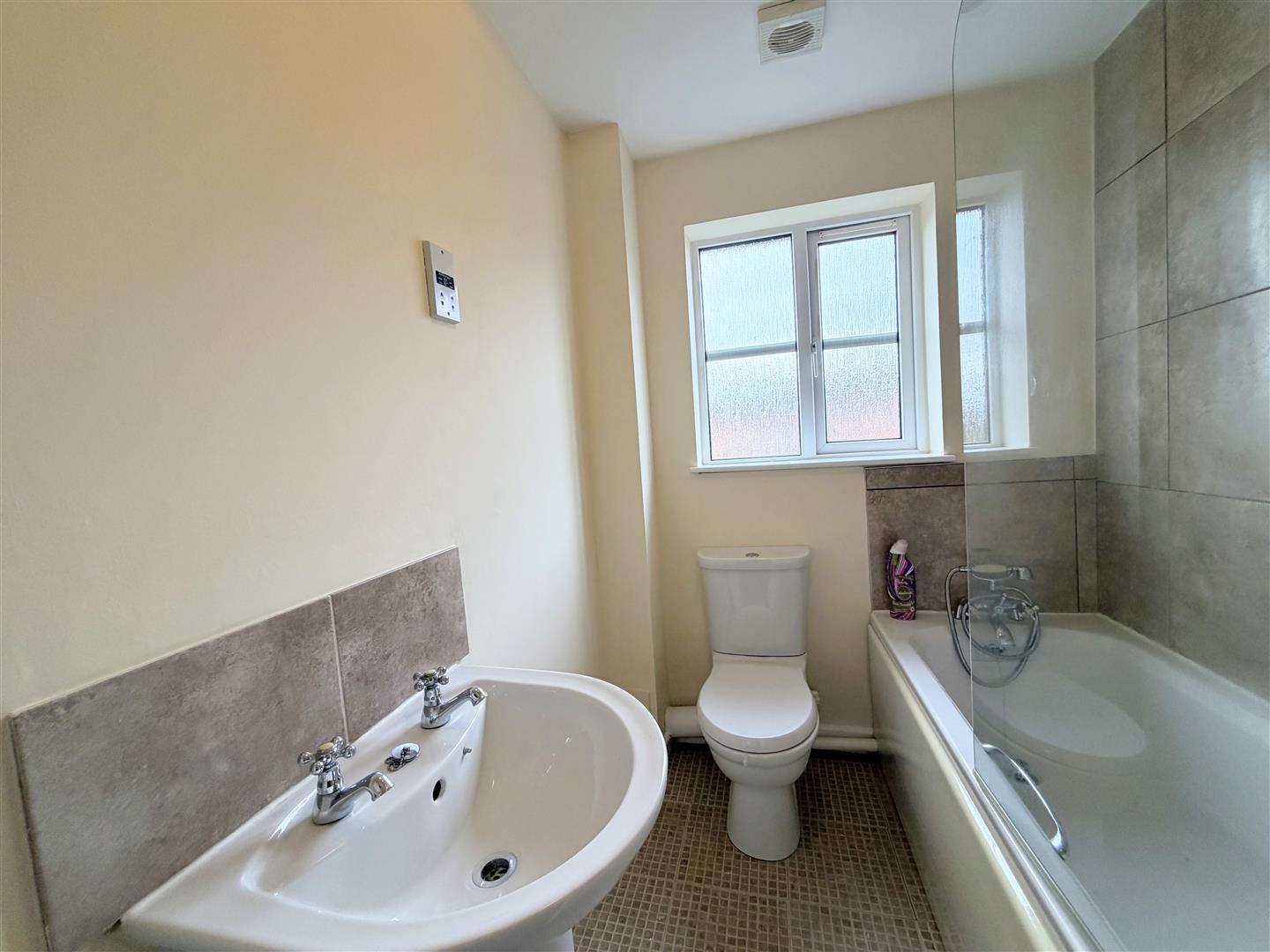 Bathroom - 2.49m x 1.65m (8'02 x 5'05) - White suite comprising panel bath with electric Mira shower over and tiled surround, low-level WC, pedestal wash hand basin with tiled splashback, radiator, and side aspect double-glazed UPVC frosted window.