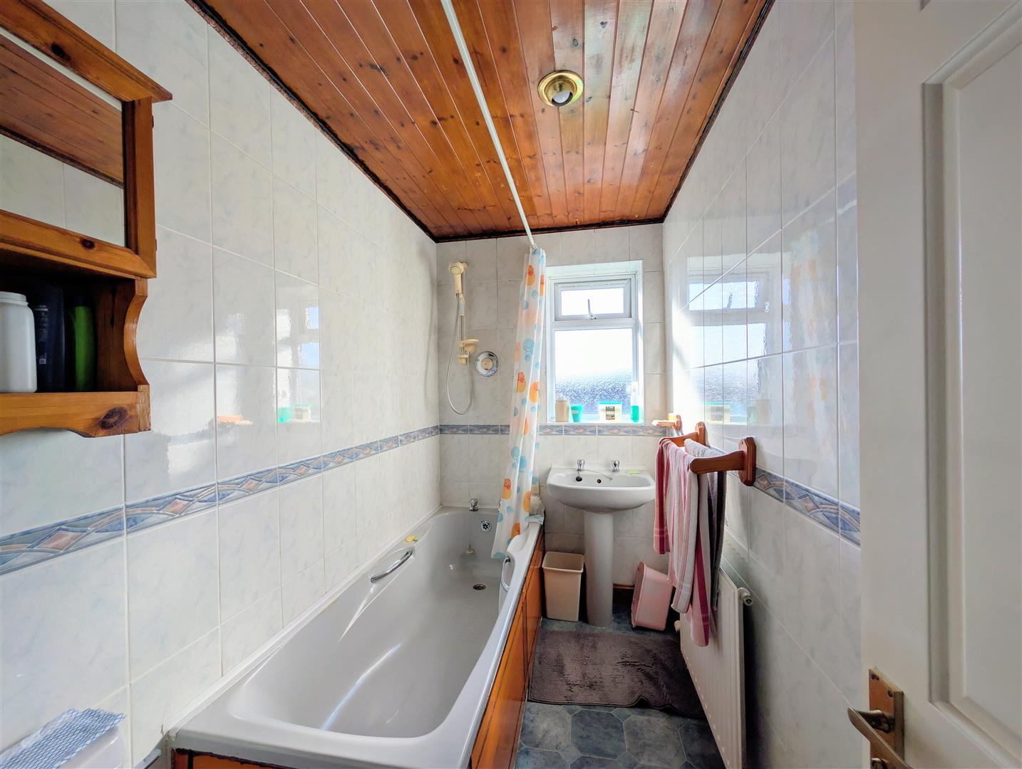 Bathroom - 2.44m x 1.24m (8'00 x 4'01) - Fitted with a grey-coloured suite comprising panelled bath with mains-fed shower over, pedestal wash hand basin and low-level WC. Radiator, tiled walls and side-facing double-glazed uPVC frosted window.