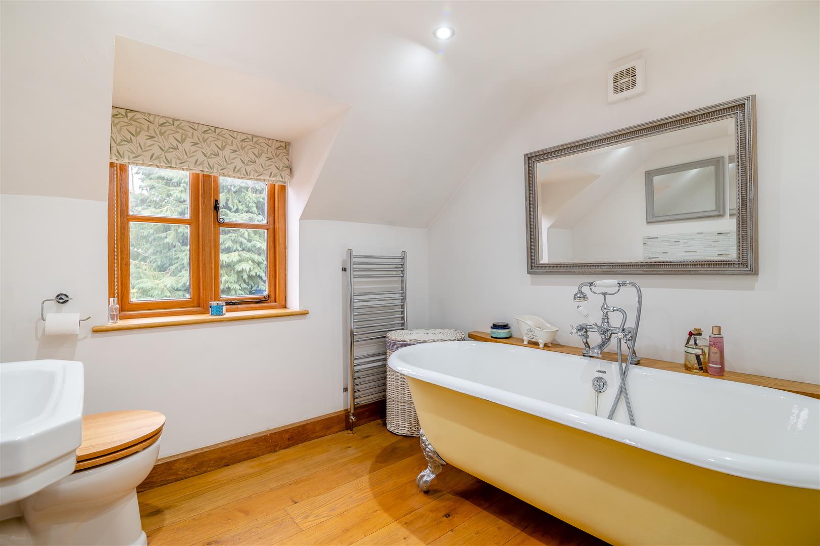 Bathroom - 2.64m x 2.44m (8'08 x 8'00) - Side aspect upvc double glazed oak style framed window, rolled top bath with bath taps over, sink with tap over, close coupled wc, extractor fan, inset celling spotlights.