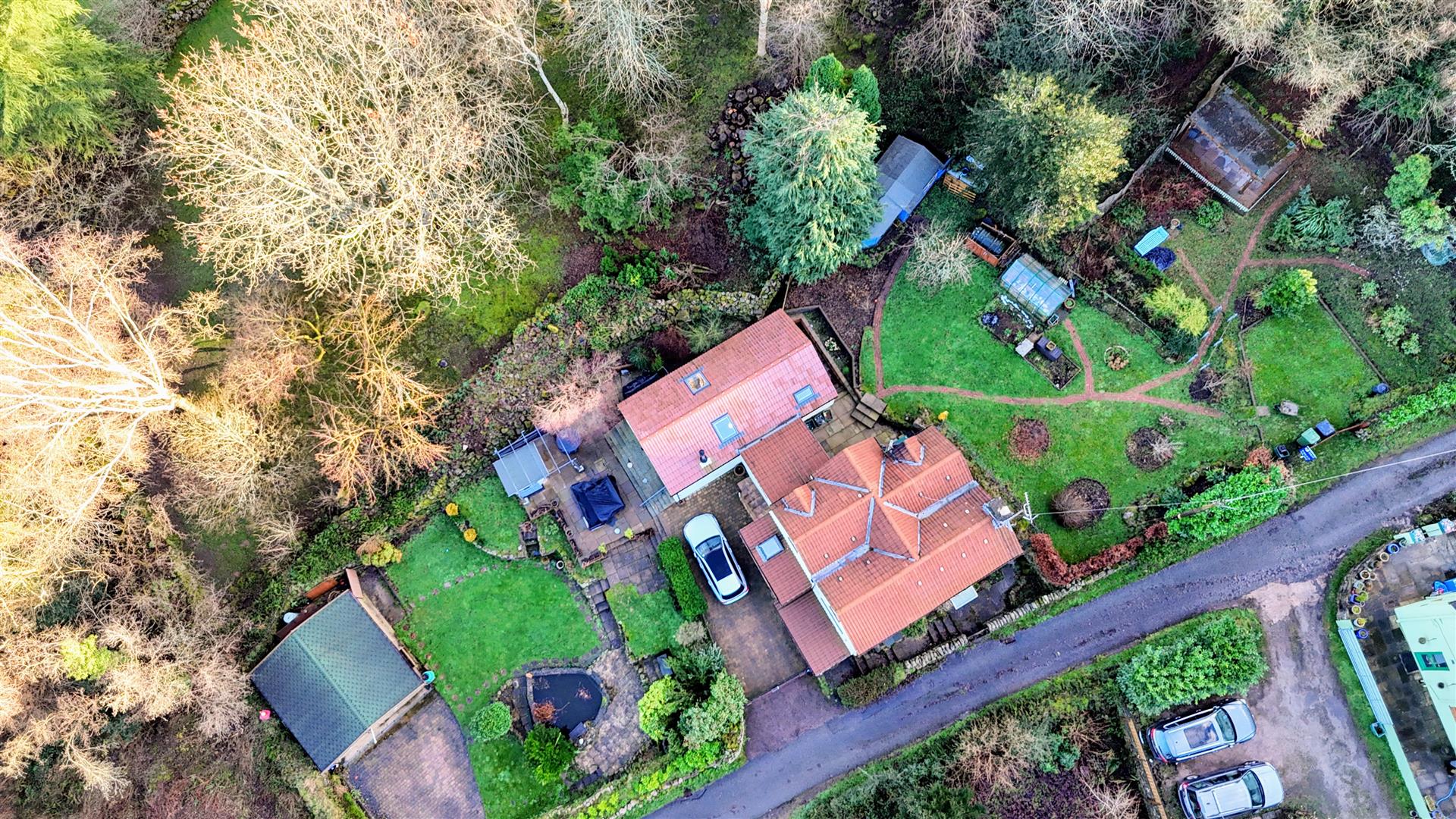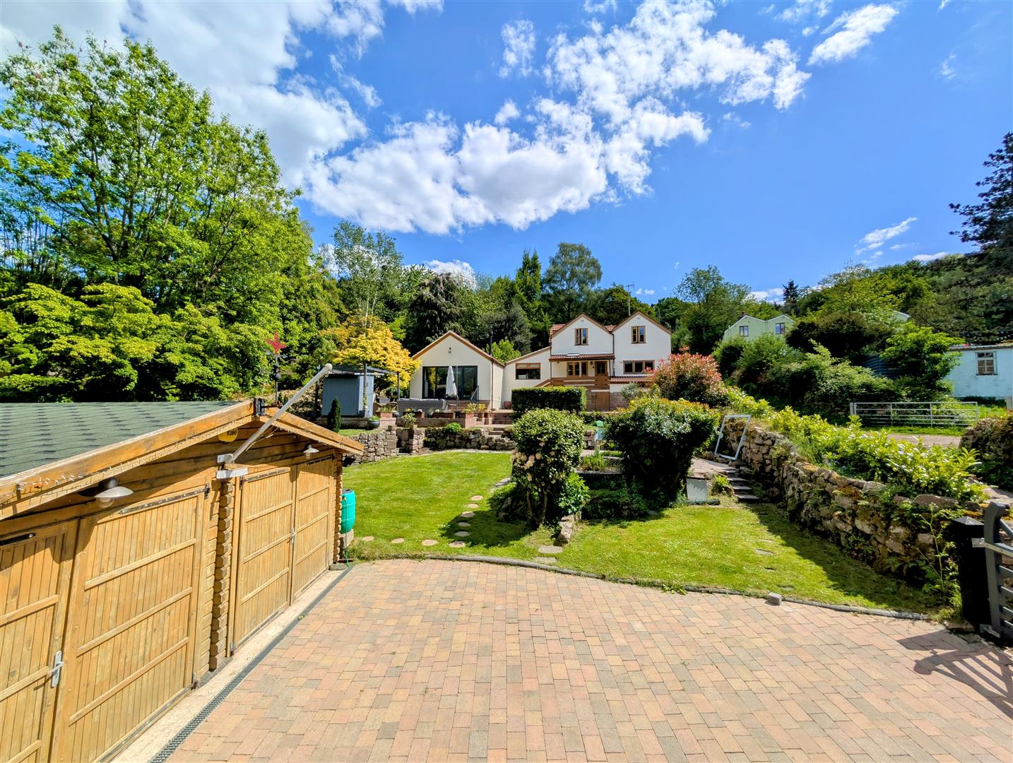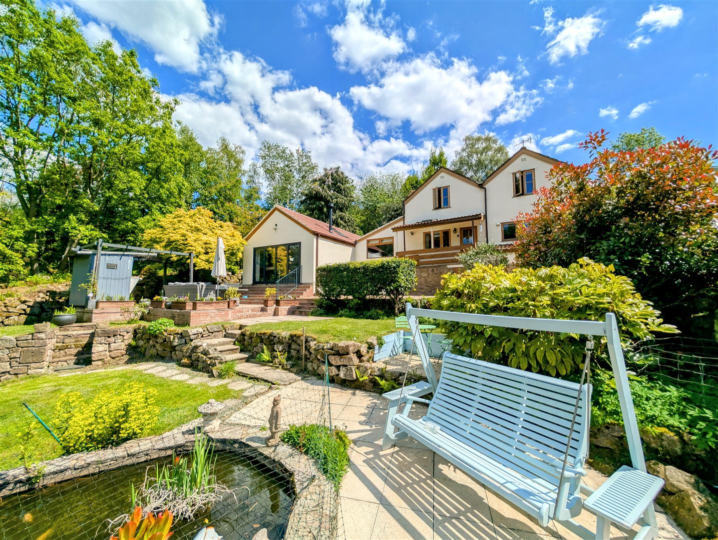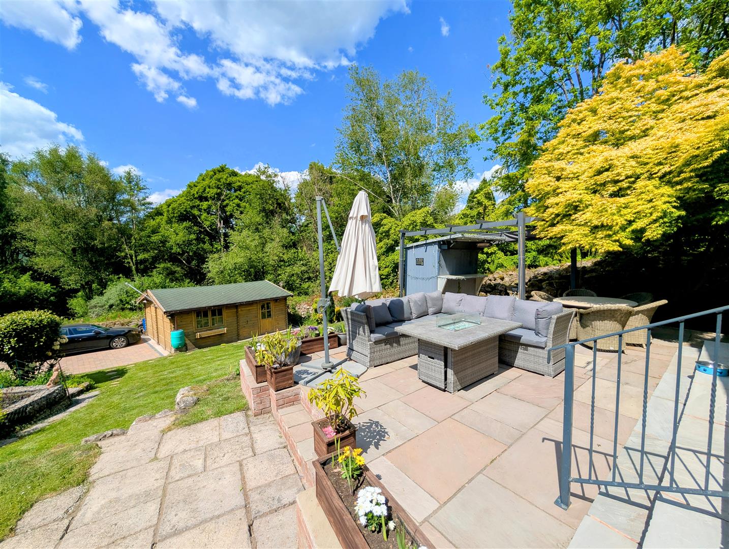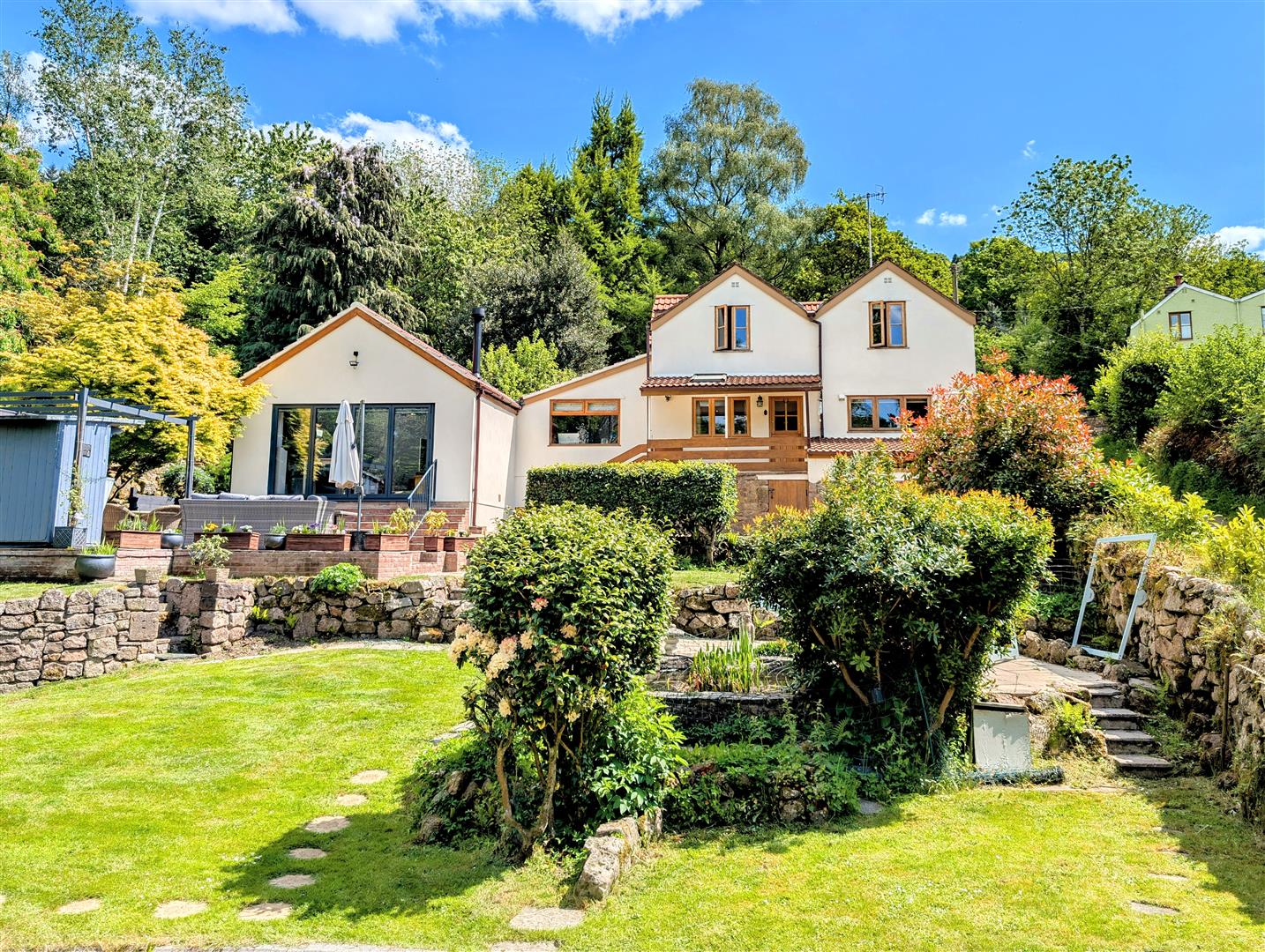 Rear Garden - Large patio area, steps leading up to a mostly laid to lawn area, brick pathway which gives access to a shed, a greenhouse, planters, raised beds, undercover pergola area which is a stunning entertaining space, Worcester outside boiler.
