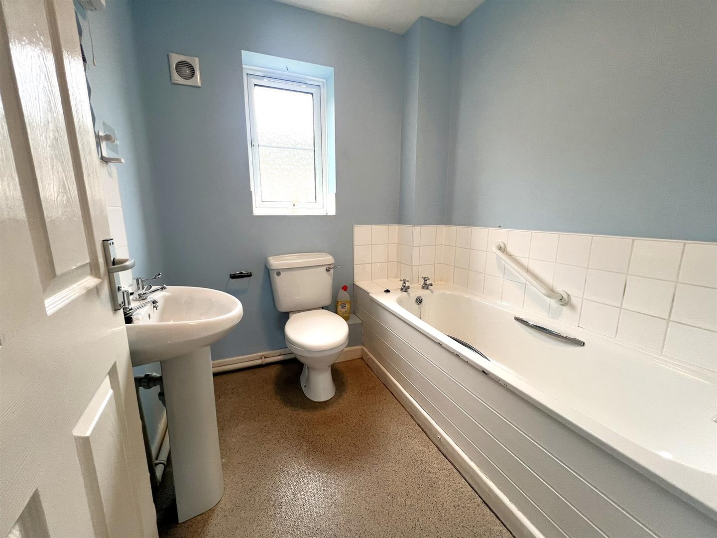 Family Bathroom - White suite with modern side panel bath, wooden side panelling and tiled surround, non-slip flooring, close coupled w.c, pedestal wash hand basin with tiled splashback, single radiator, ceiling light, extractor fan, shaver light and point, rear aspect upvc obscure double glazed Georgian bar window.