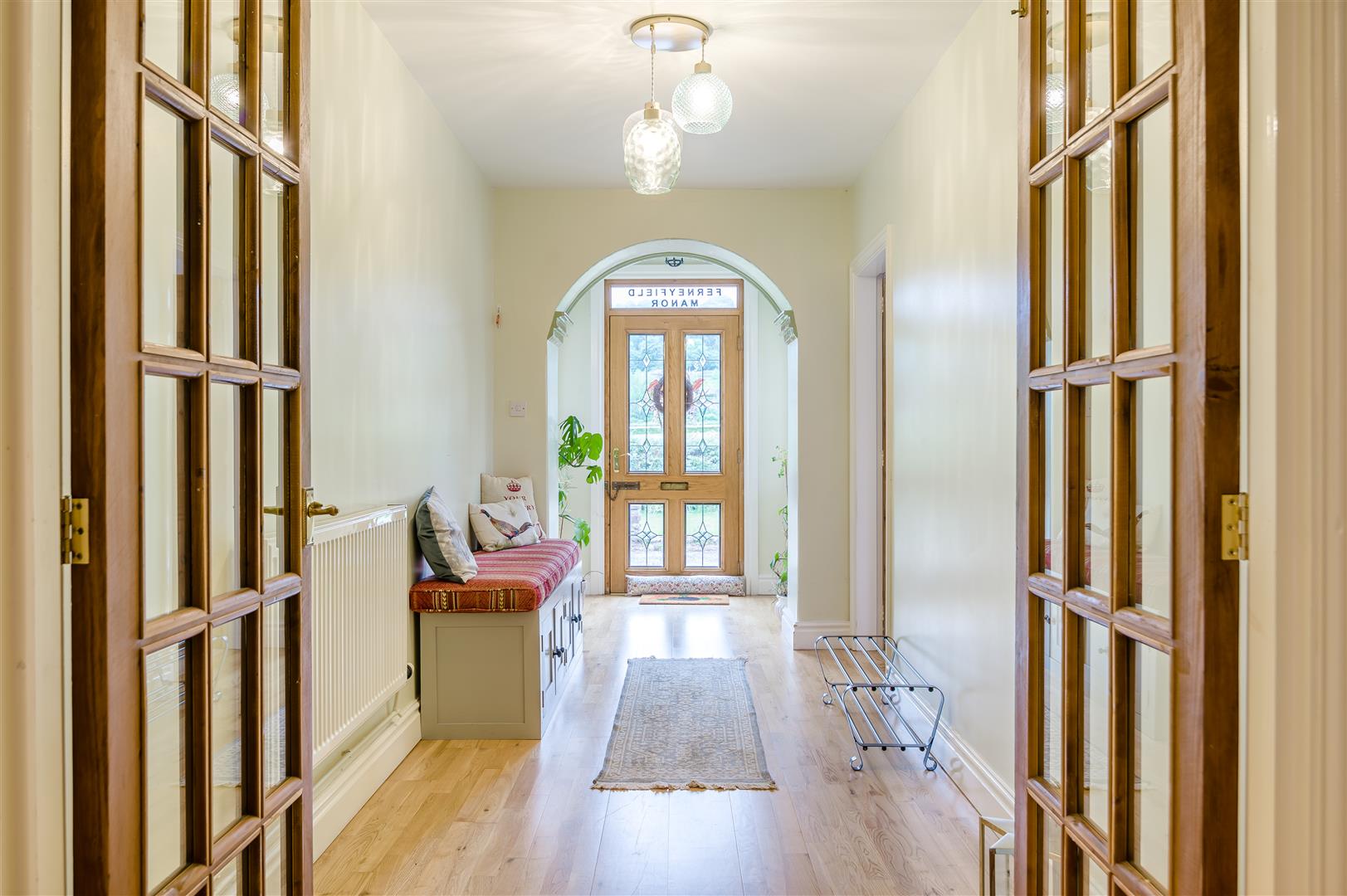 Main Entrance Hall - A bright and welcoming space with a radiator, oak flooring, door leads to the office/living room, double doors lead through to the central hallway.