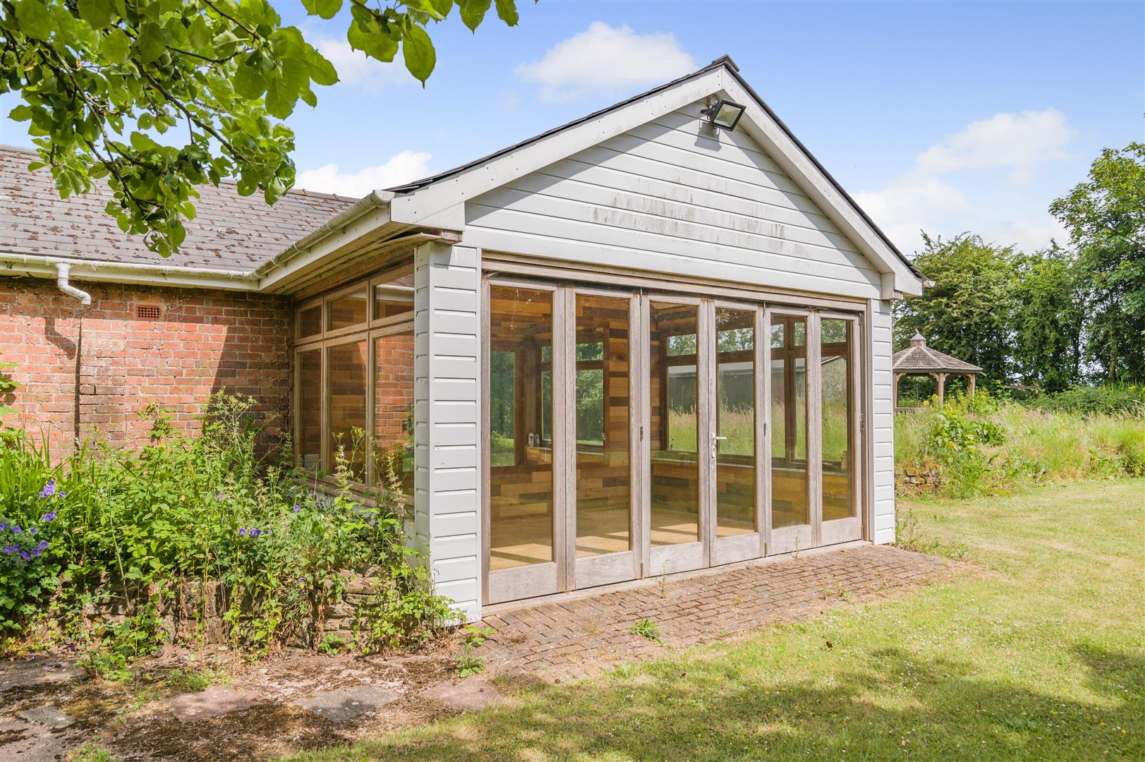 Outside - The property is approached through a pair of newly installed electric gates, opening onto a spacious gravelled driveway. Mature, lawned gardens wrap around the front and right-hand side of the home, offering a peaceful setting and giving access to a charming Garden Room via French doors. This room measures 15'00" x 11'05" and features oak flooring, power, and lighting-ideal for relaxing or entertaining.