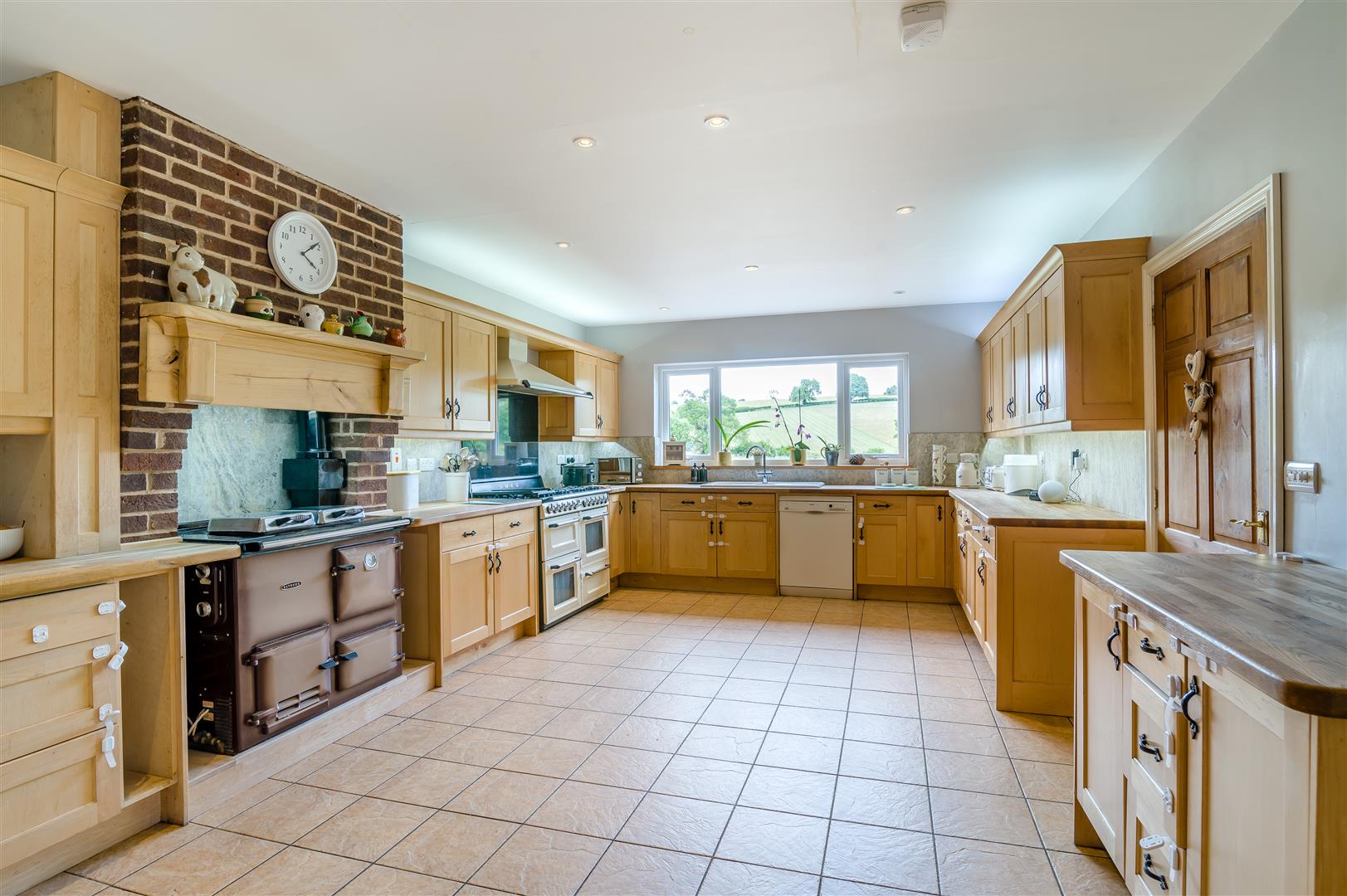 Kitchen/Dining Room - 7.90m x 7.62m (25'11 x 25'00) - The central hub of the home with bespoke handmade wall and base level units with oak worktops, fitted range cooker with two ovens and a warming draw, grill and seven ring hob with extractor over. Inset 1.5 bowl sink unit with waste disposal, space for an American style fridge/freezer, space and plumbing for a dishwasher, gas fired Rayburn (not working) with travertine tile splash-backs, ceramic tile floor. Rear aspect window, archway through to the dining area with continuation of the ceramic tile floor, radiator, side aspect sliding patio door leads to the garden. From the kitchen a door leads to the rear hall and internal hall with w.c.