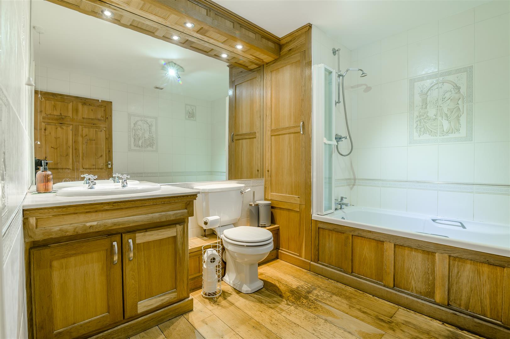 En-Suite Bathroom - Comprising a panelled bath with shower over, low level w.c, pedestal washbasin, tiled walls, oak flooring.