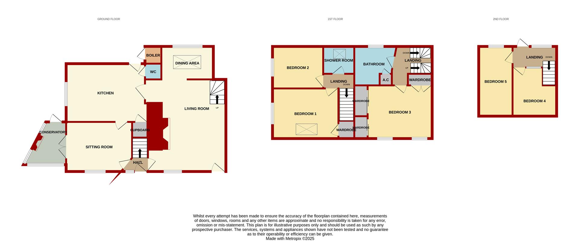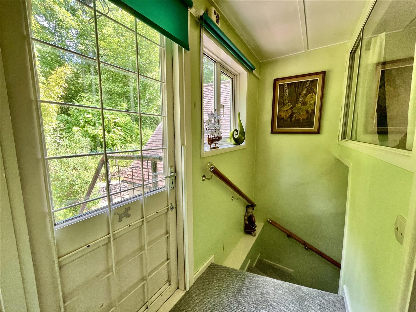 Second floor landing with rear aspect window and door with an external metal staircase leading down to the garden. Doors lead to bedrooms four and five.
