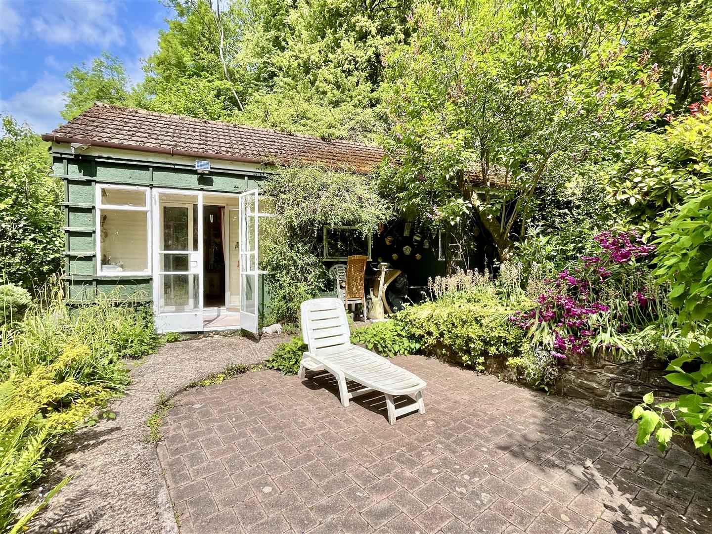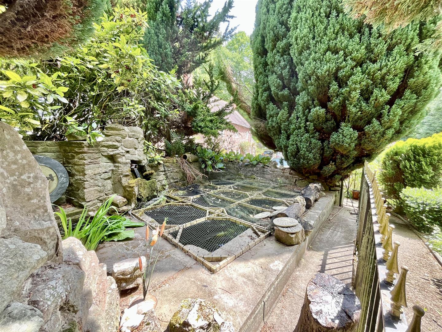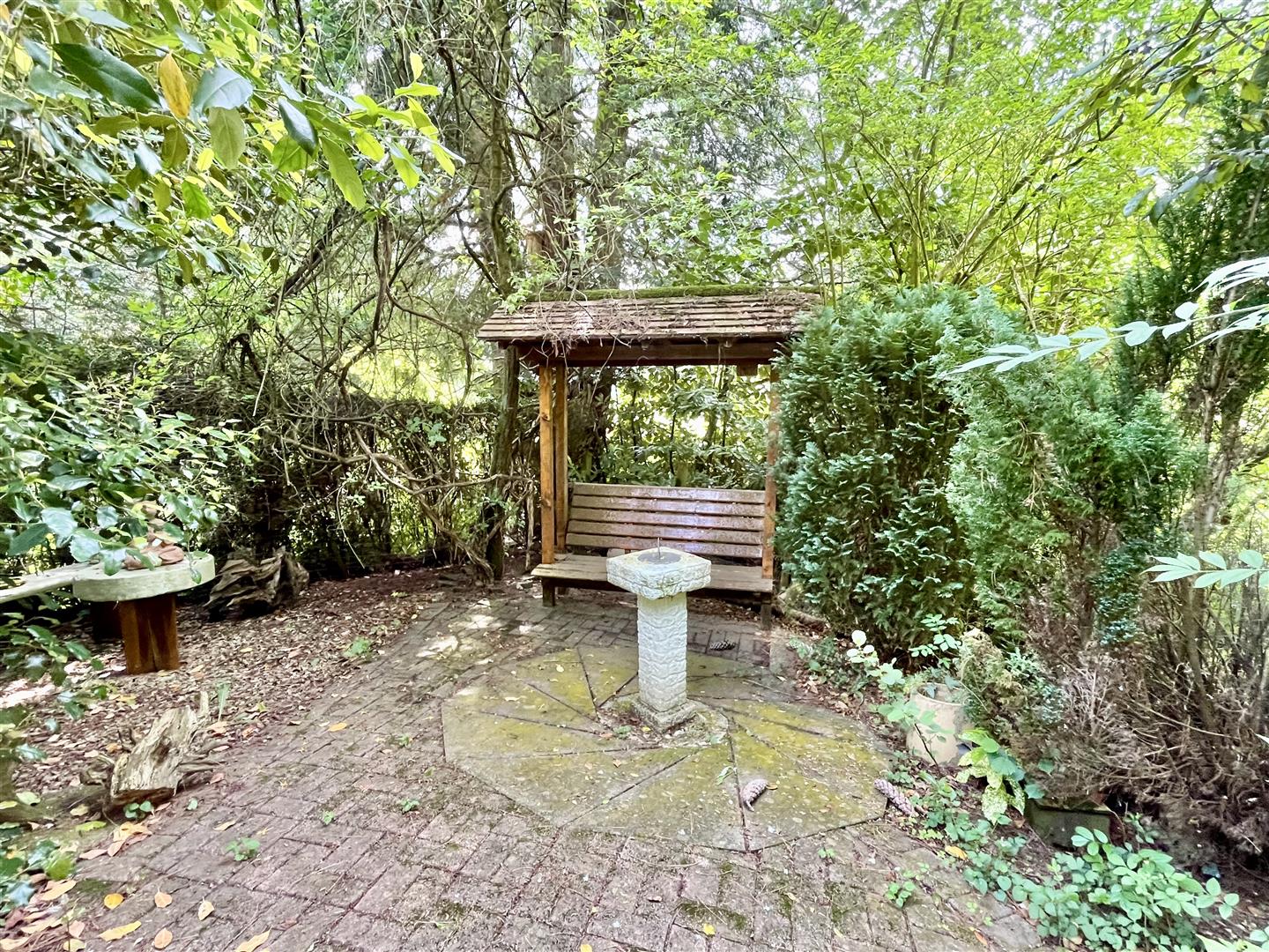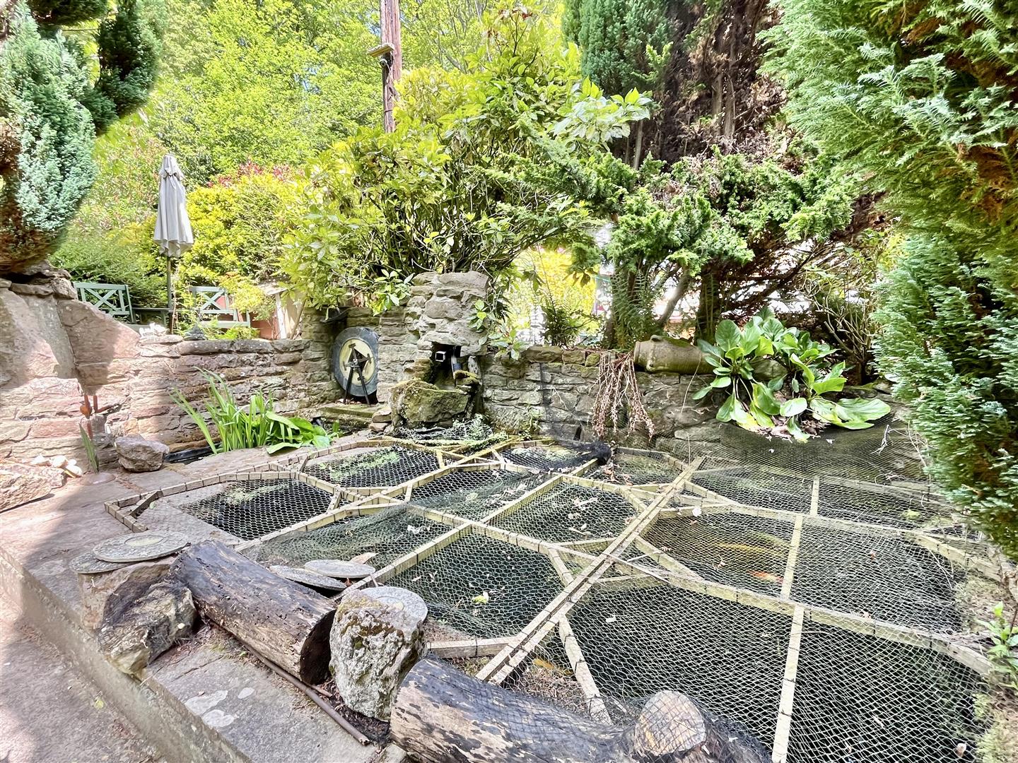 Outside - Adjacent to the drive is a well-maintained lawn bordered by attractive flowerbeds and a variety of mature trees. Steps and pathways wind through the landscaped gardens, which feature multiple seating areas, a koi carp pond, a mobile home, an aviary, several sheds, workshops, and a greenhouse. To the rear, there is direct access to open woodland.
