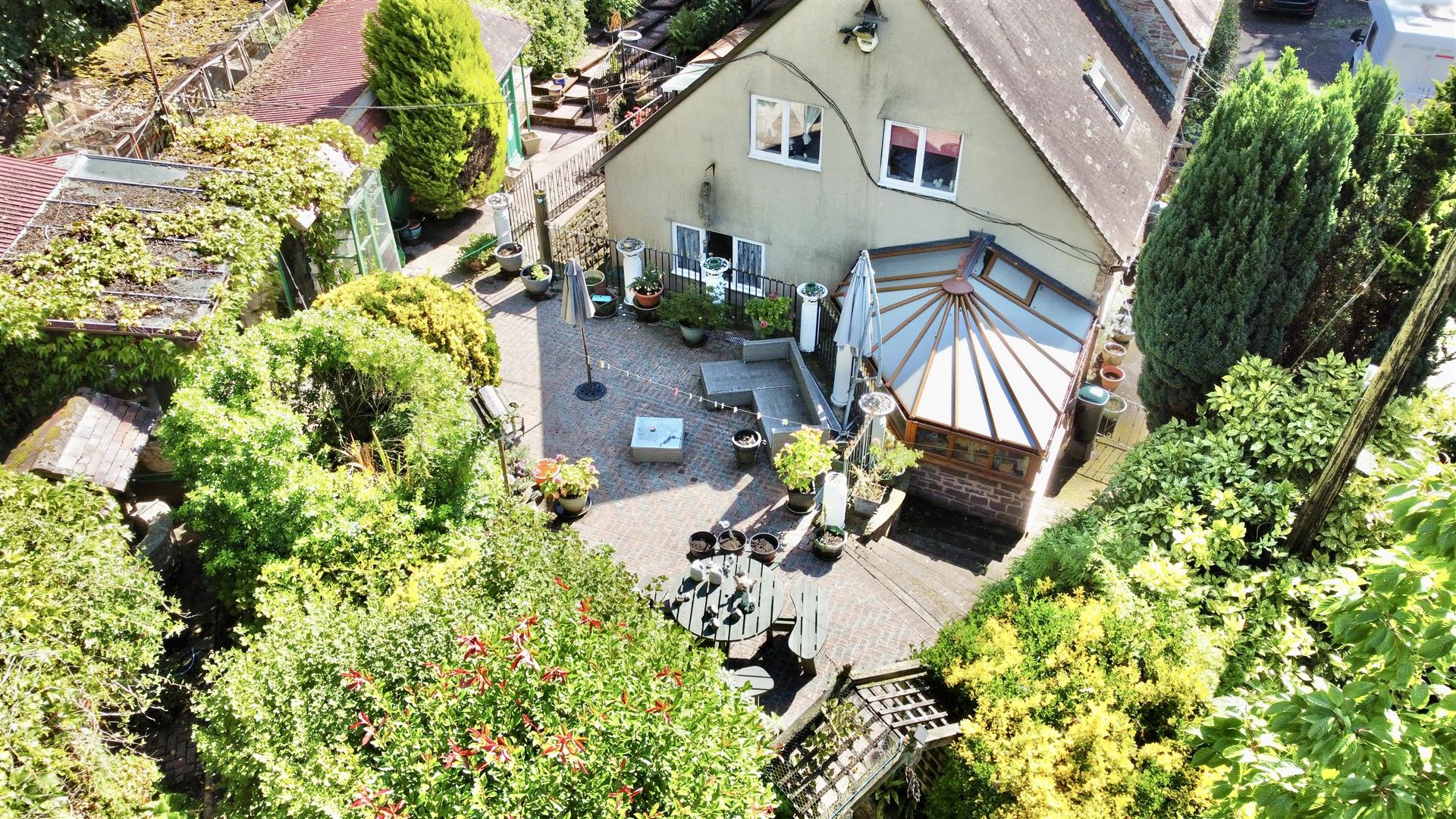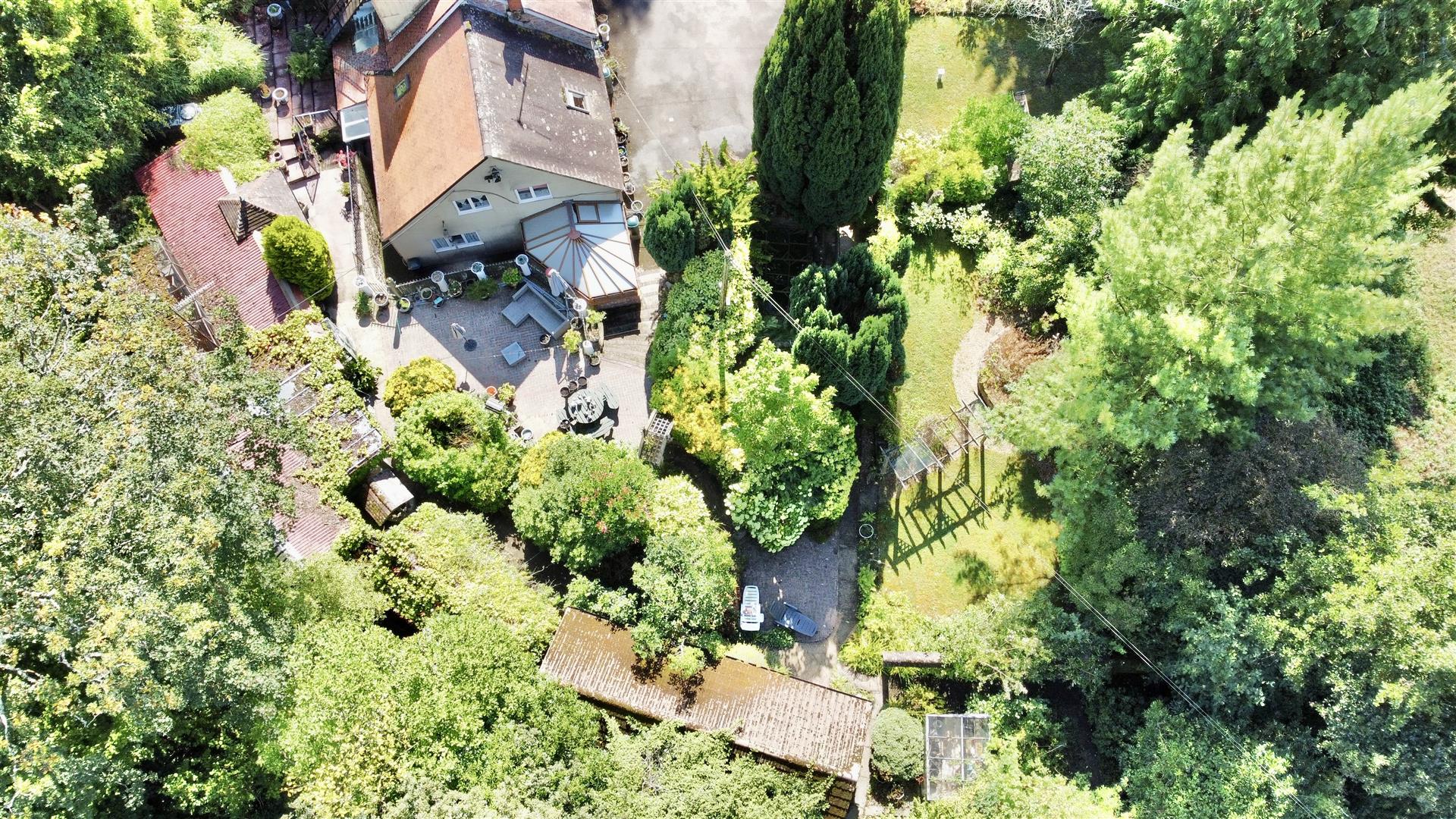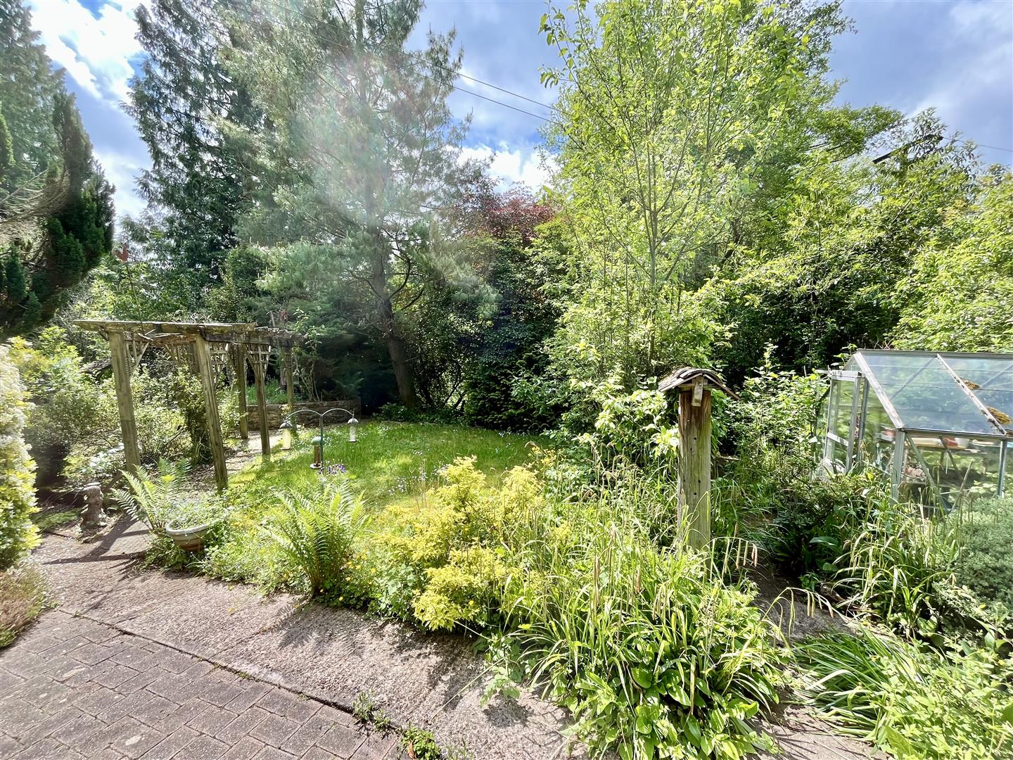 Outside - Adjacent to the drive is a well-maintained lawn bordered by attractive flowerbeds and a variety of mature trees. Steps and pathways wind through the landscaped gardens, which feature multiple seating areas, a koi carp pond, a mobile home, an aviary, several sheds, workshops, and a greenhouse. To the rear, there is direct access to open woodland.