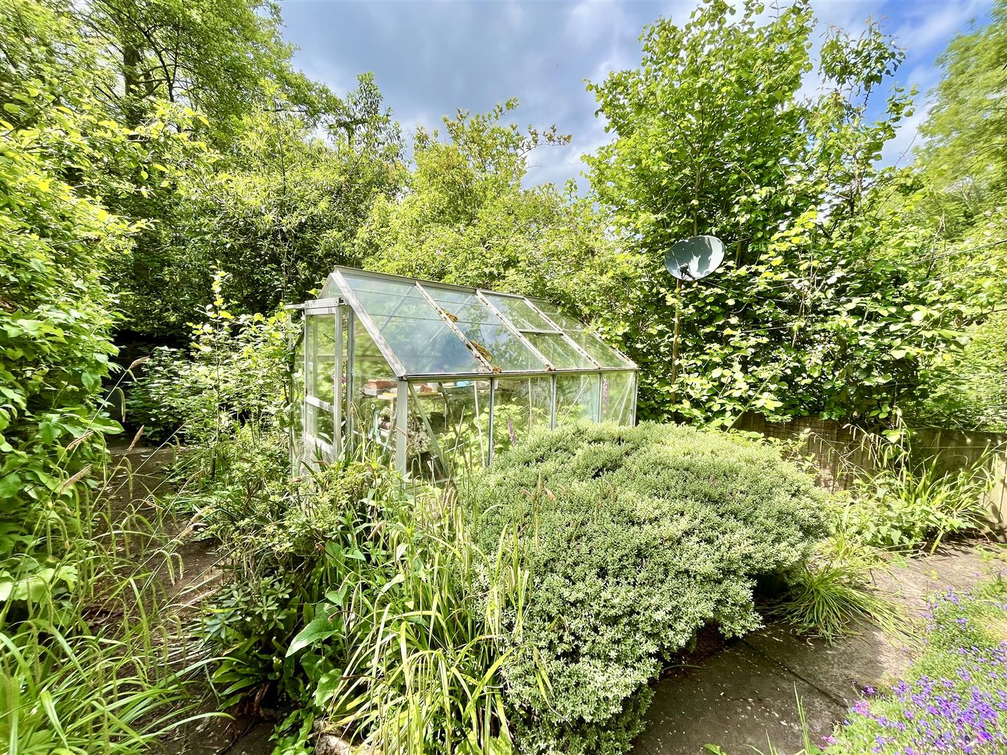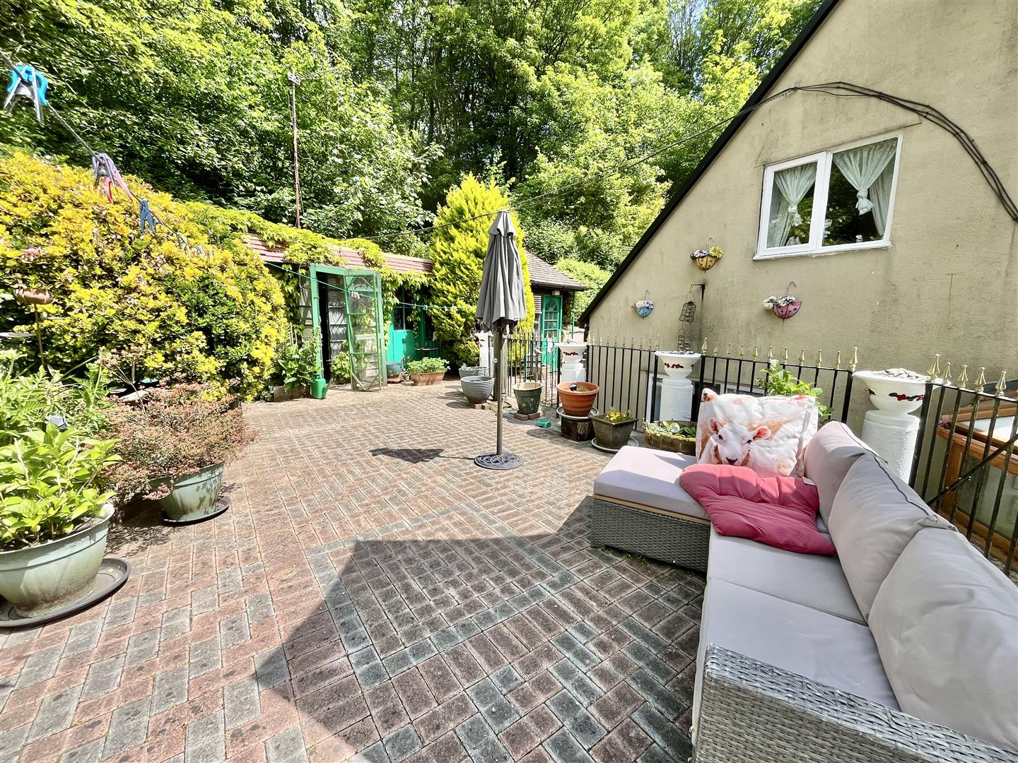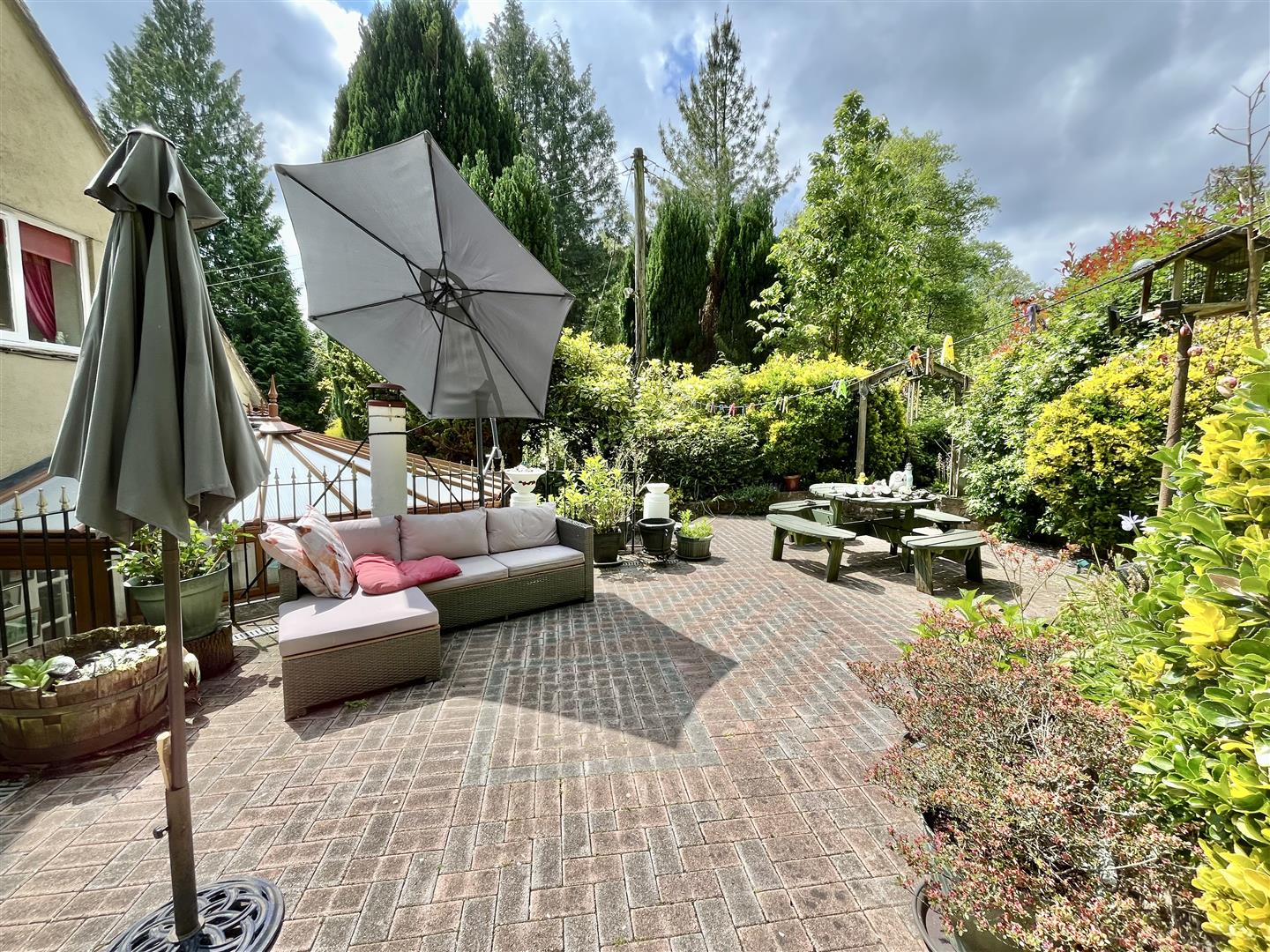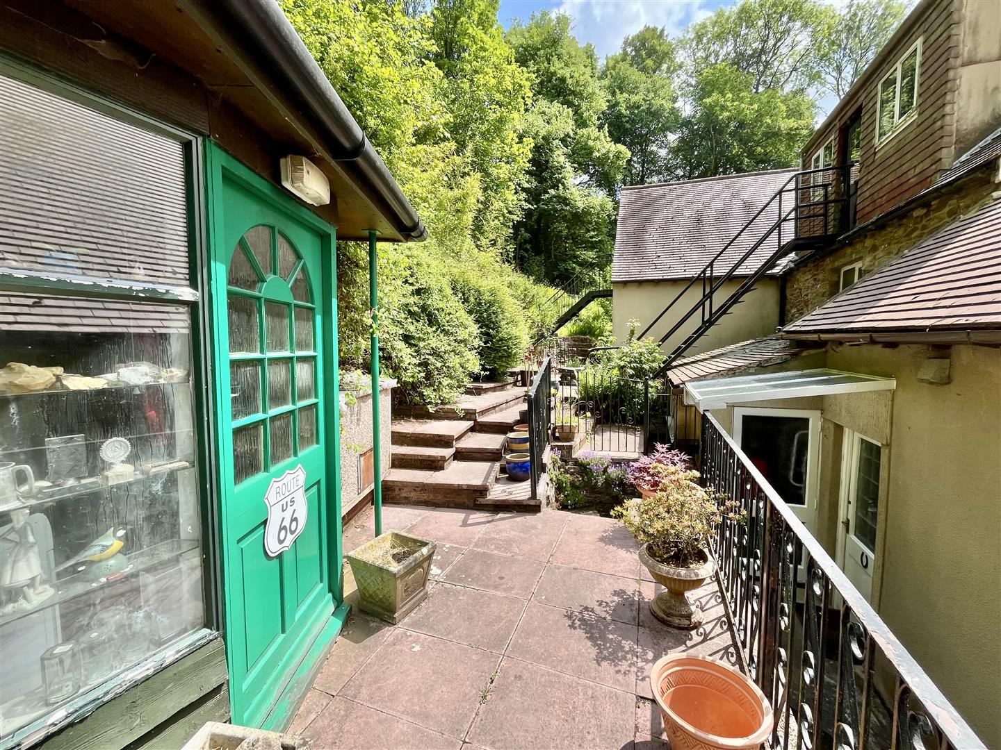 Outside - Adjacent to the drive is a well-maintained lawn bordered by attractive flowerbeds and a variety of mature trees. Steps and pathways wind through the landscaped gardens, which feature multiple seating areas, a koi carp pond, a mobile home, an aviary, several sheds, workshops, and a greenhouse. To the rear, there is direct access to open woodland.