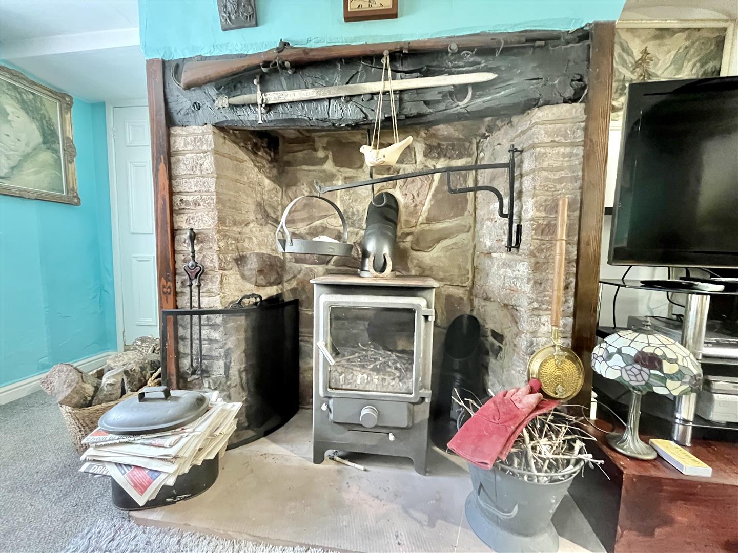 Living Room - 5.94m x 5.00m (19'6" x 16'5") - A spacious room with an original fireplace with wood burning stove, exposed beams, fitted storage and display units, radiators, front aspect door and window, spiral staircase leads up to the first floor. Opens through to the dining area, stable door to the kitchen.