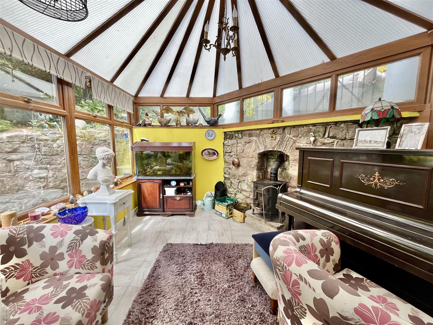 Conservatory - 3.40m x 3.10m (11'2" x 10'2") - Wood burning stove sat on a raised stone hearth, power points and lighting, tiled floor, rear aspect door to the garden