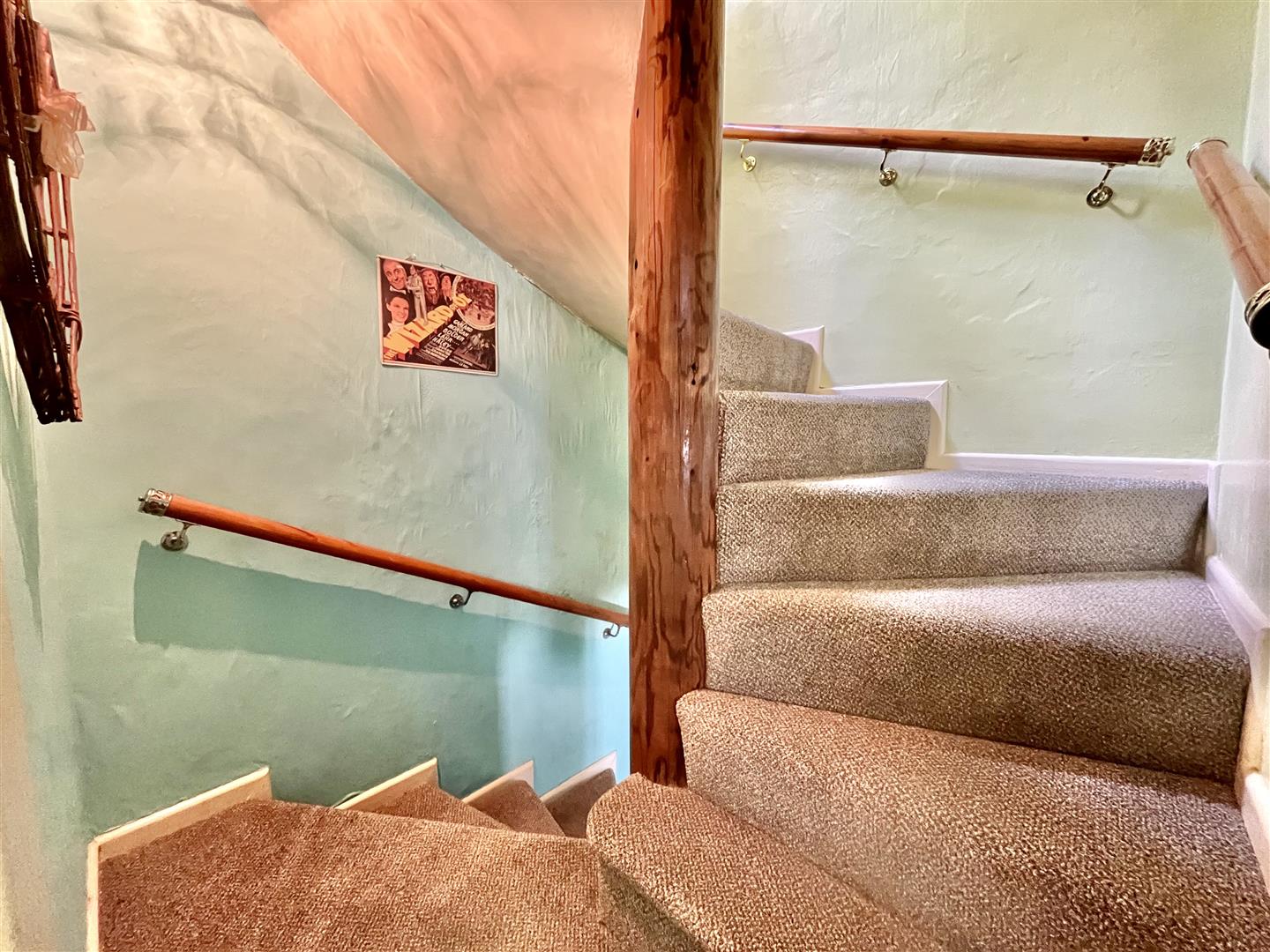 From the living room, a spiral staircase leads to a first floor landing with doors leading off to bedroom three and the bathroom. The staircase continues to the second floor.