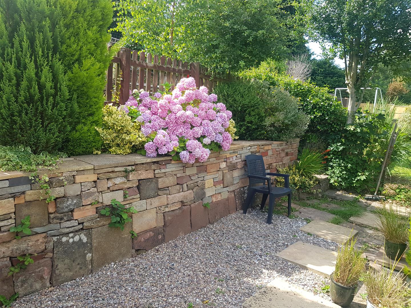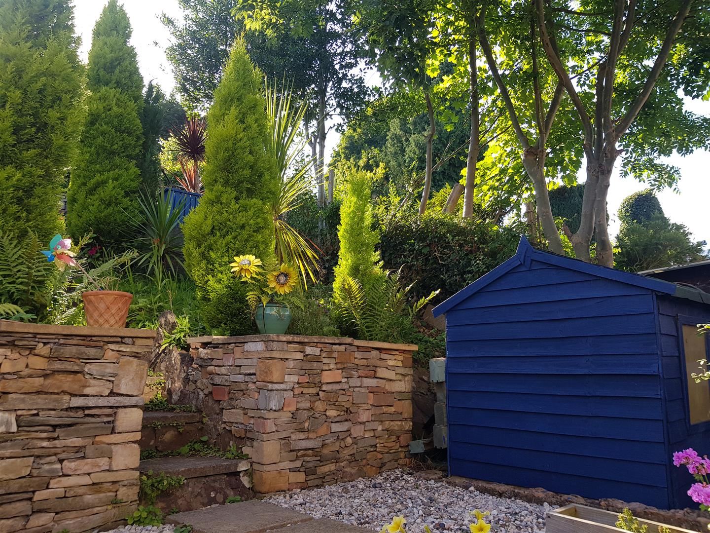 Rear Garden - The rear garden features a charming patio and seating area, with tiered landscaping that includes multiple patio spaces. At the top, a level lawn provides additional outdoor space, complemented by a timber-framed shed. The garden also offers convenient external power points, outside lighting, and a water tap. Enclosed by fencing and hedging, the space ensures privacy while enjoying picturesque views of the surrounding fields and countryside.