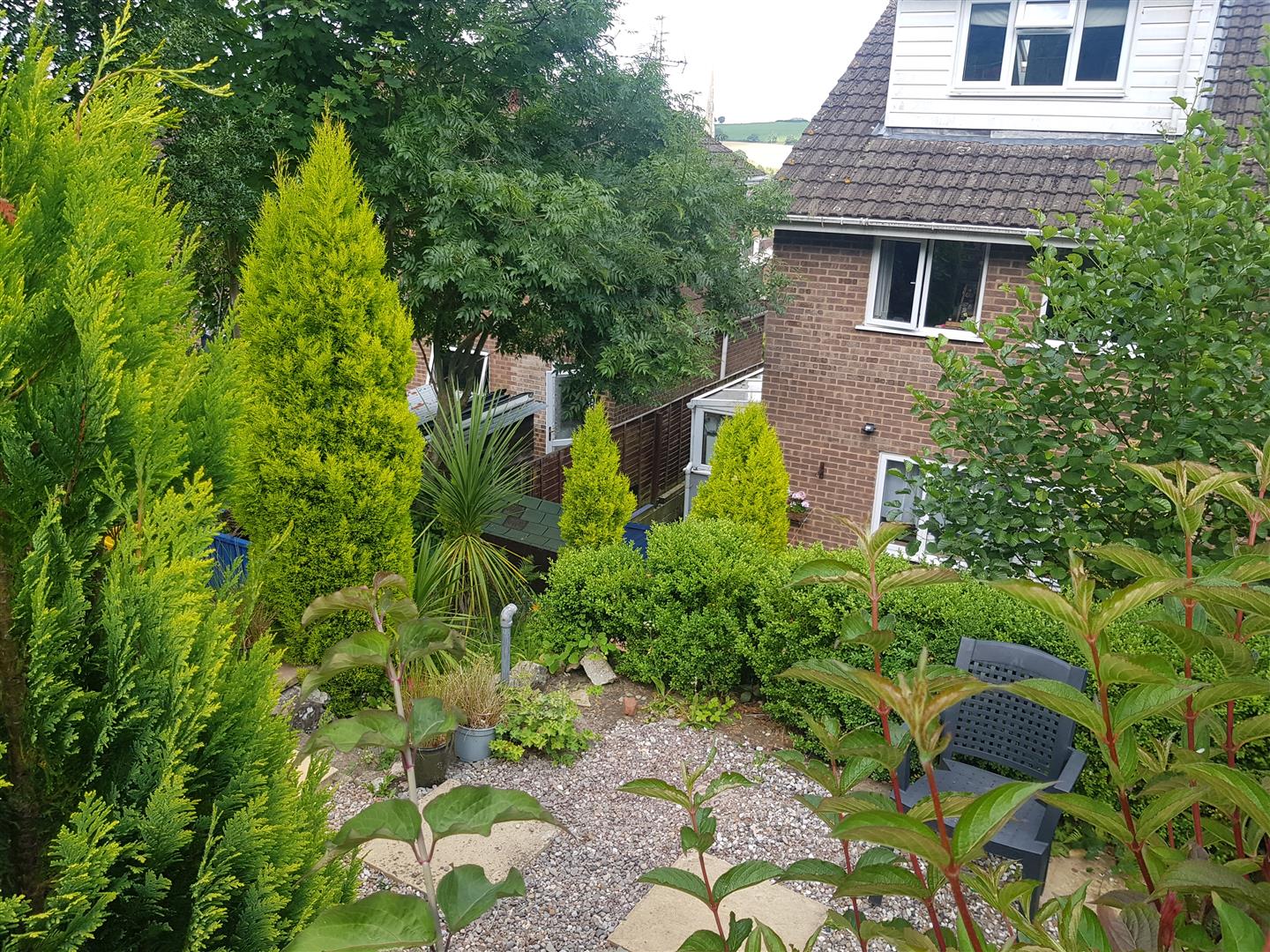 Outside - At the front of the property, shared steps lead up to the main entrance, complemented by outside lighting. The area features a gently sloped lawn, a gated access to a patio/seating area, and an additional outside light for convenience. The front garden offers delightful rooftop views overlooking fields and the countryside. A pathway extends along the side of the property, providing access to the rear garden.